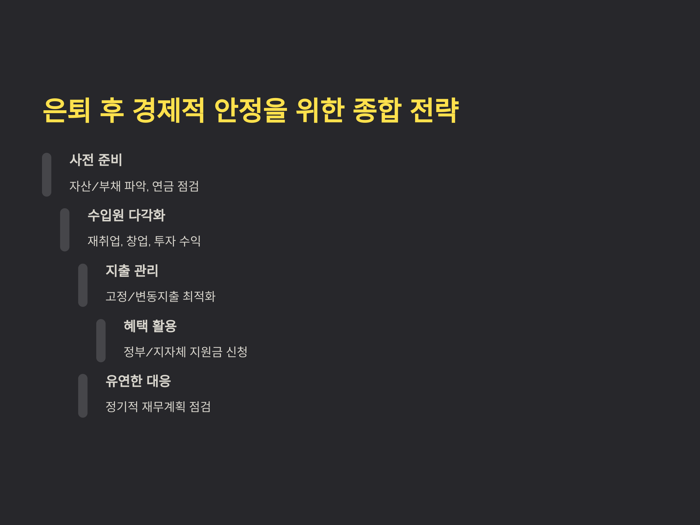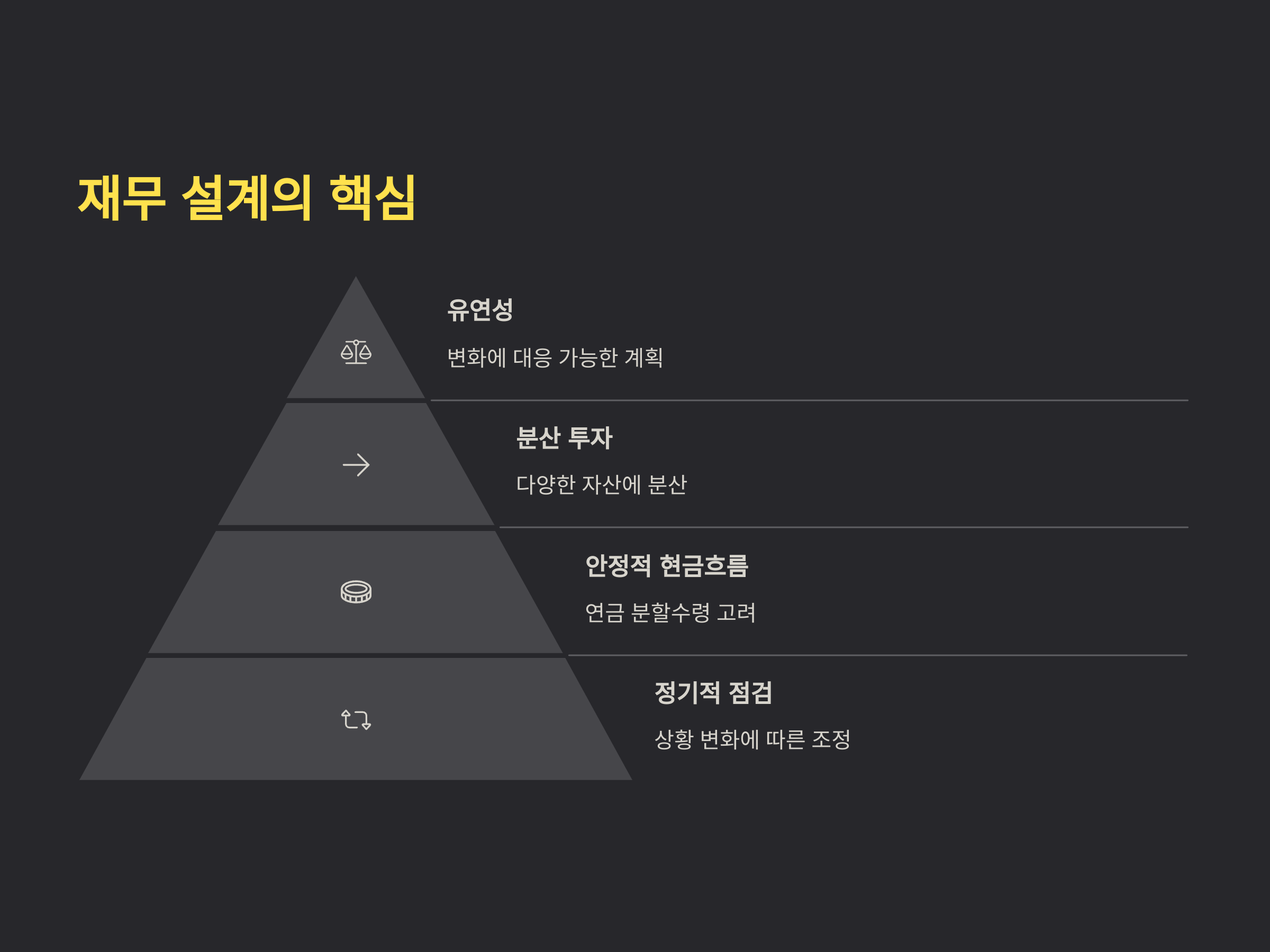 퇴직 이후의 재무 설계에서 가장 중요한 것은 ‘유연성’입니다. 예측하지 못한 의료비, 자녀 지원, 갑작스러운 생활비 증가 등 다양한 상황에 대비할 수 있어야 하며, 이를 위해 투자와 소비, 보험과 연금 자산을 분산해두는 전략이 필수입니다.