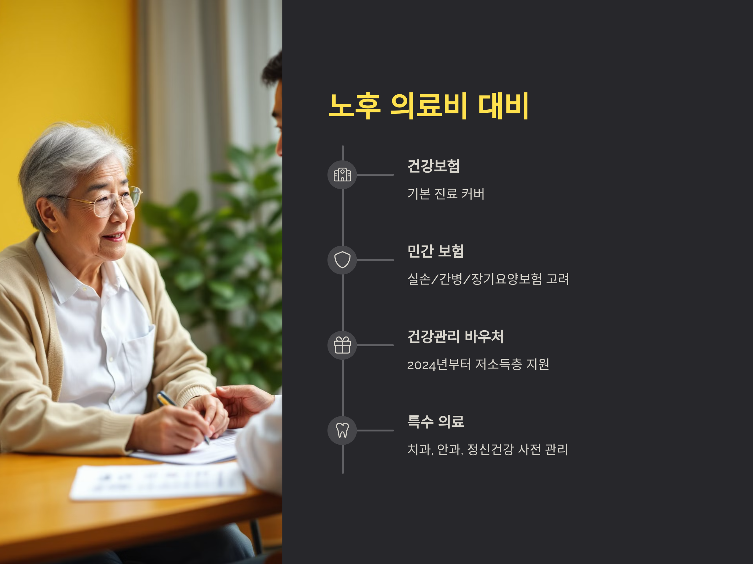 노후의 가장 큰 경제적 변수 중 하나는 의료비입니다. 실제로 은퇴자들이 가장 불안해하는 요소로 의료비를 꼽는 경우가 많습니다. 현재 건강보험이 대부분의 기본 진료를 커버하지만, 고액의 치료나 요양 서비스는 부담이 될 수 있습니다. 따라서 실손보험이나 간병보험, 장기요양보험 등의 민간 보험을 함께 고려해보는 것이 중요합니다.