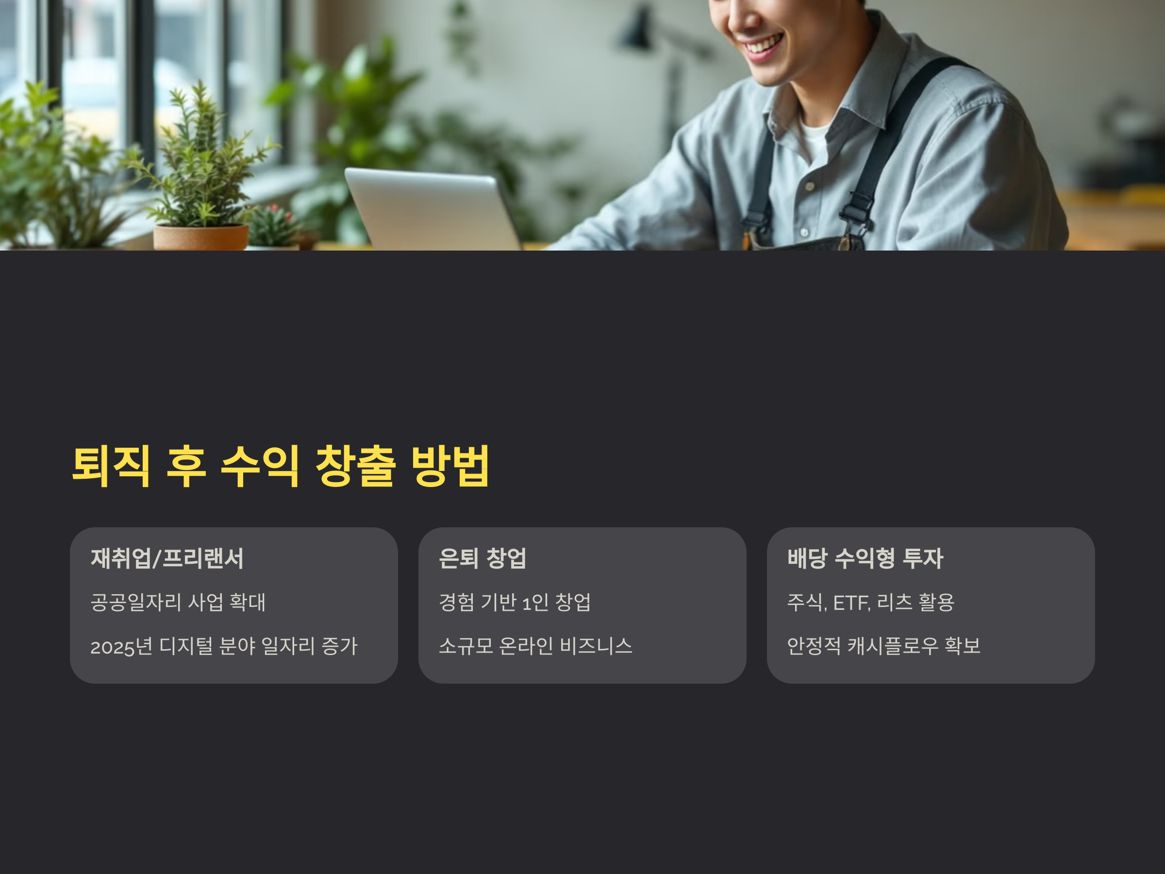 퇴직 이후 수익을 창출하는 방법은 다양합니다. 우선 가장 일반적인 방법은 '재취업'이나 '프리랜서' 형태의 일입니다. 특히 정부에서는 만 60세 이상 고령자 대상의 공공일자리 사업을 매년 확대하고 있으며, 2025년부터는 디지털 분야에서도 고령자 맞춤형 일자리가 늘어날 예정입니다. 이와 더불어 '은퇴 창업'도 유망한 선택지로 떠오르고 있습니다. 자신이 경험과 전문성을 갖춘 분야를 기반으로 한 1인 창업이나, 소규모 온라인 비즈니스는 초기 자본 부담 없이 시작할 수 있어 실질적인 수익 창출이 가능합니다.