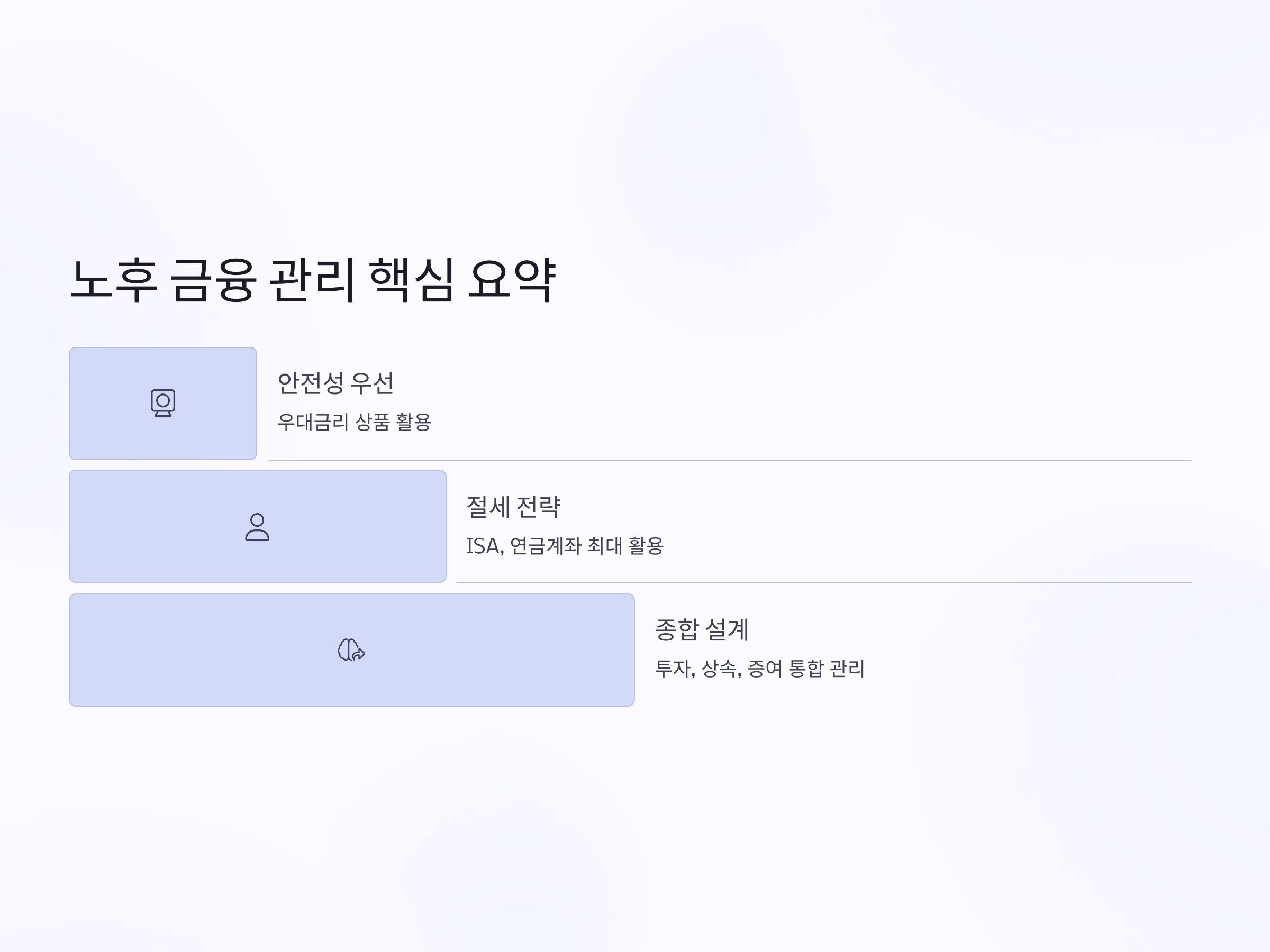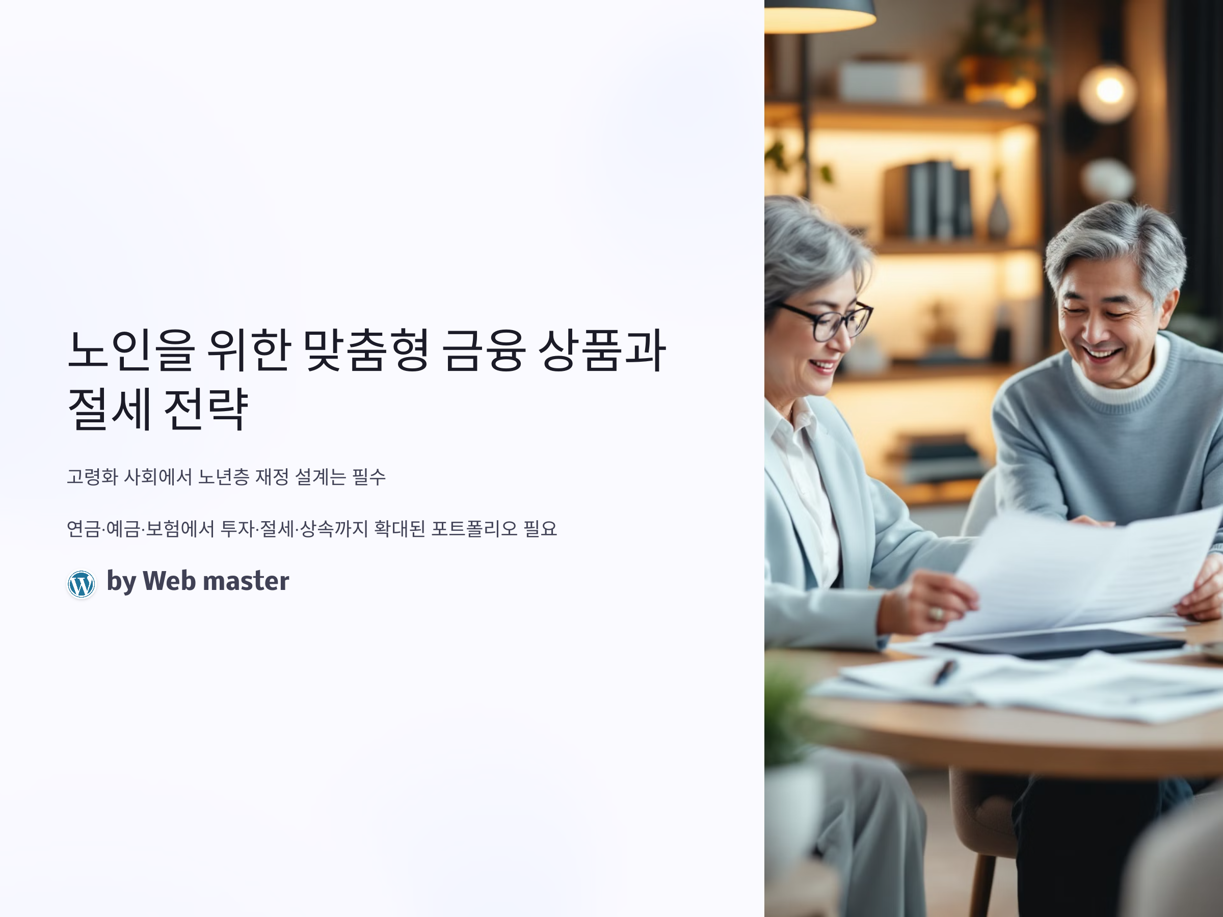 빠르게 고령화 사회로 진입하고 있는 대한민국에서, 노년층의 재정 설계는 더 이상 선택이 아닌 필수입니다. 특히 최근 정부의 고령자 복지 강화 정책과 더불어 금융기관들 역시 노인을 위한 특화된 상품을 앞다투어 출시하고 있습니다. 이에 따라 '연금·예금·보험' 중심에서 '투자·절세·상속'까지 확대된 맞춤형 포트폴리오 설계가 요구됩니다.