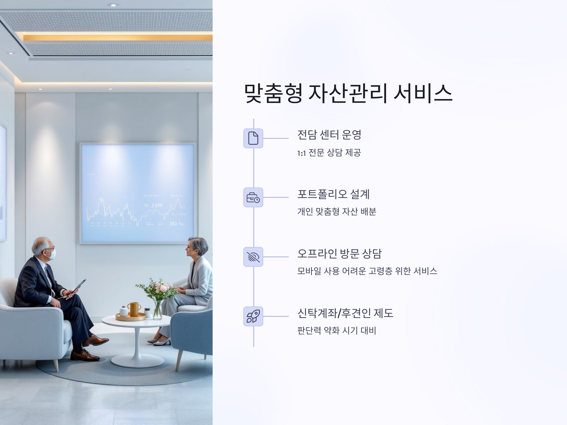 최근에는 고령자 맞춤형 자산관리 서비스가 디지털 기반으로 진화하고 있습니다. 은행과 보험사, 자산운용사들이 공동으로 고령자 전담 센터를 운영하며, 1:1 전문 상담 및 포트폴리오 설계를 제공하는 것이 특징입니다. 특히 모바일 사용에 어려움을 겪는 고령층을 위해 오프라인 방문 상담도 병행 운영되며, 일부 은행은 '시니어 전담 PB센터'까지 운영하고 있습니다.
