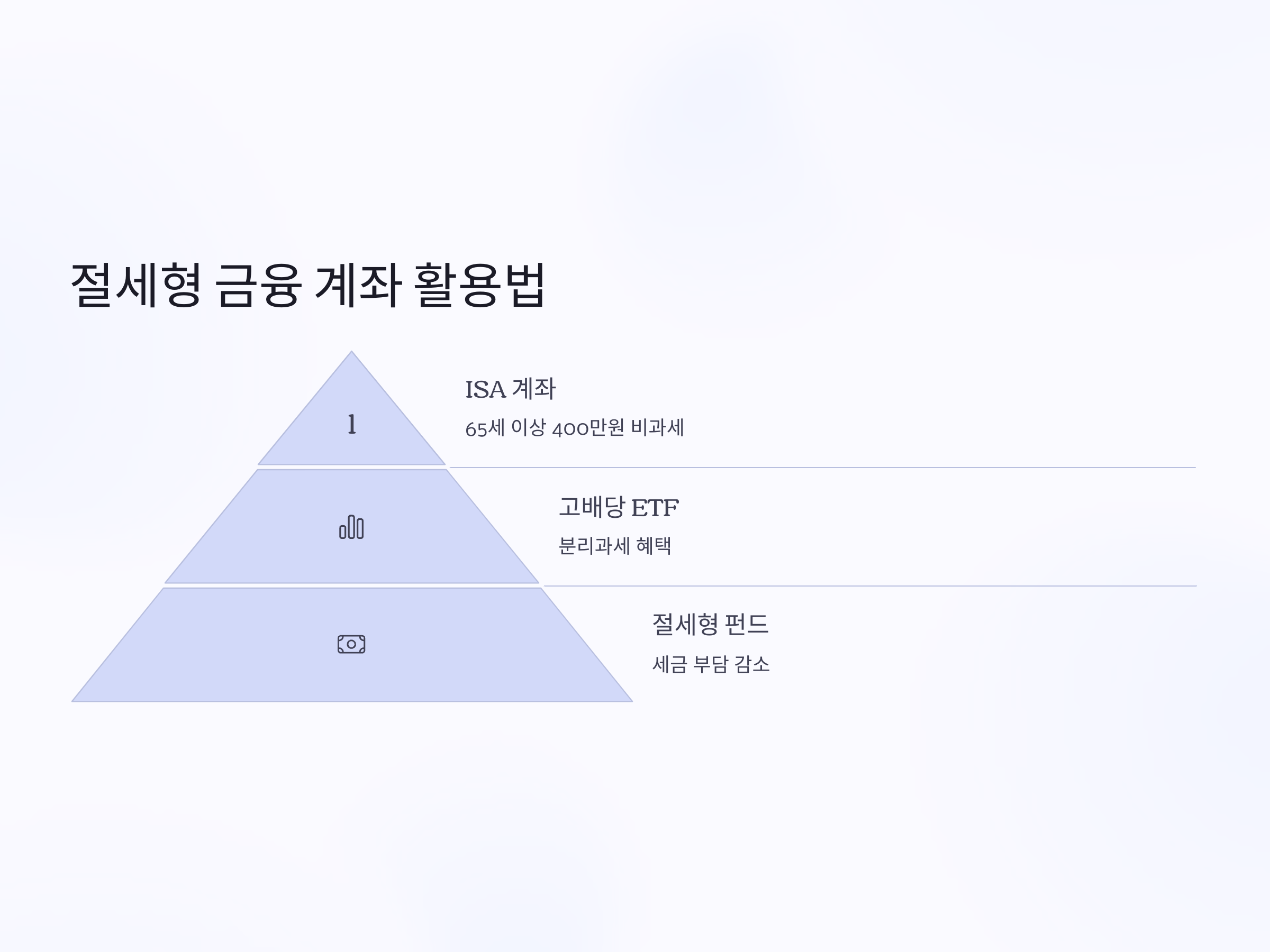 뿐만 아니라, 고배당 ETF에 투자해 분리과세 혜택을 누리거나, 고령자 대상 '절세형 펀드'에 가입해 세금 부담을 줄이는 것도 가능합니다. 이를 통해 투자 소득에 대한 세율을 효과적으로 낮출 수 있으며, 자산을 분산 투자하는 구조로 안정성과 수익성을 동시에 확보할 수 있습니다.