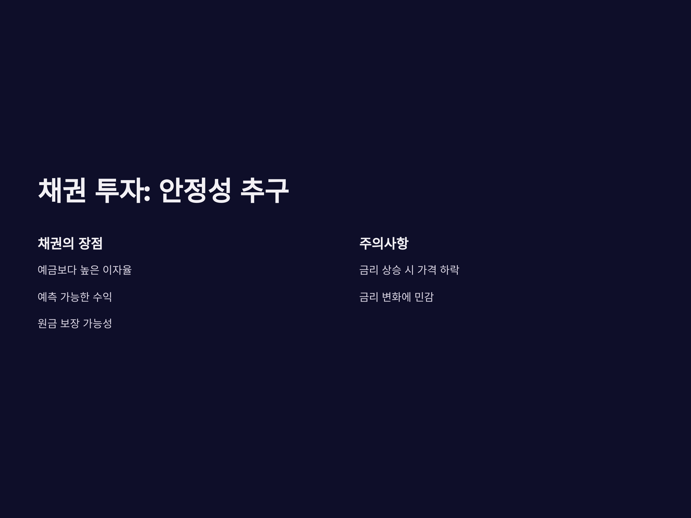 채권의 장점은 예측 가능한 수익을 제공한다는 점입니다. 따라서 안정적인 수익을 추구하는 투자자에게 적합합니다. 그러나 금리가 상승할 경우 채권 가격이 하락할 수 있기 때문에 금리 변화에 대한 민감도가 있습니다.
