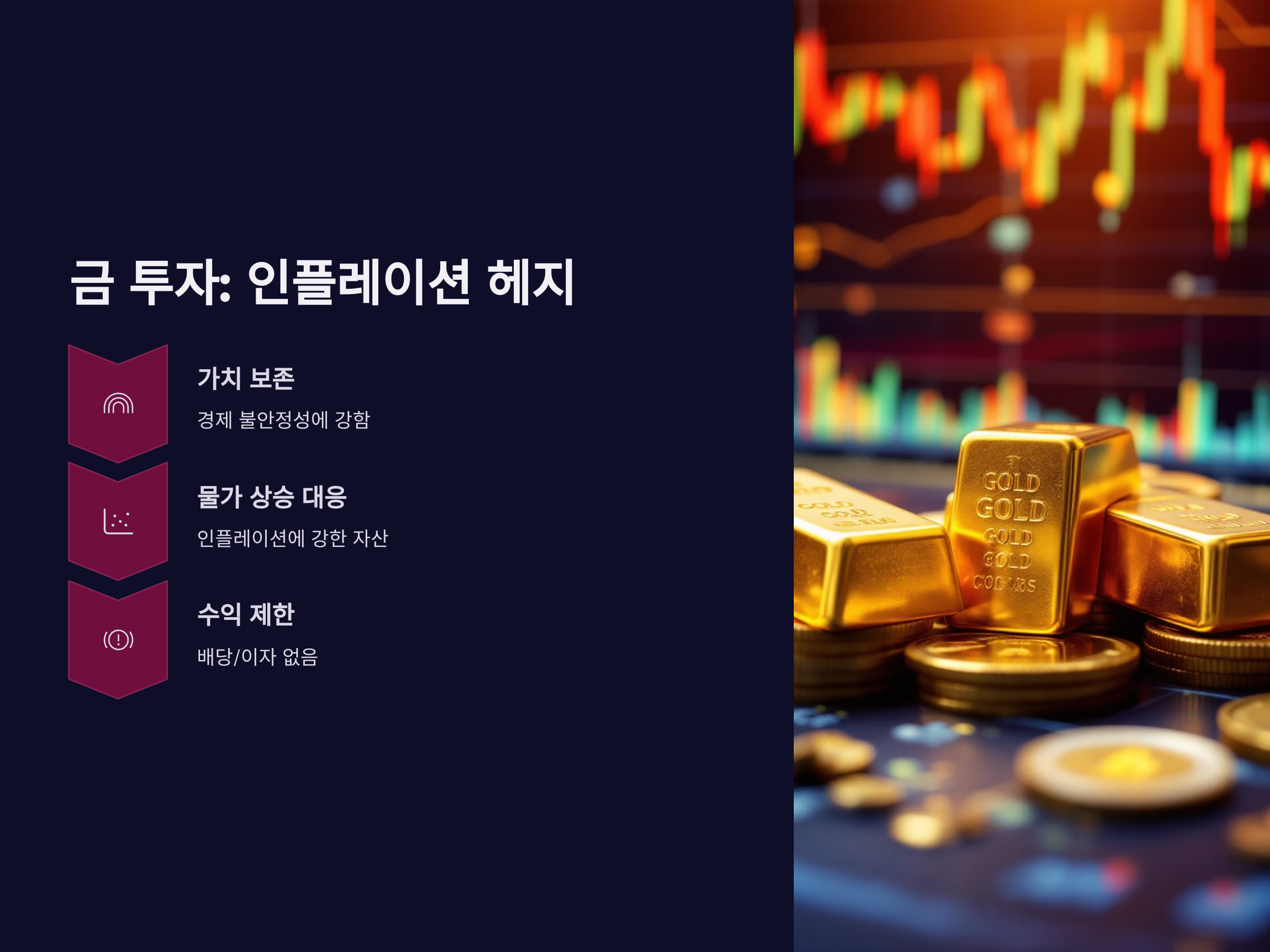 금 투자의 장점은 물가 상승에 대응할 수 있는 수단이 된다는 점입니다. 하지만 금은 배당이나 이자 수익을 제공하지 않기 때문에 장기적으로 자산을 늘리고 싶은 투자자보다는 자산을 보호하고 싶은 투자자에게 더 적합합니다.