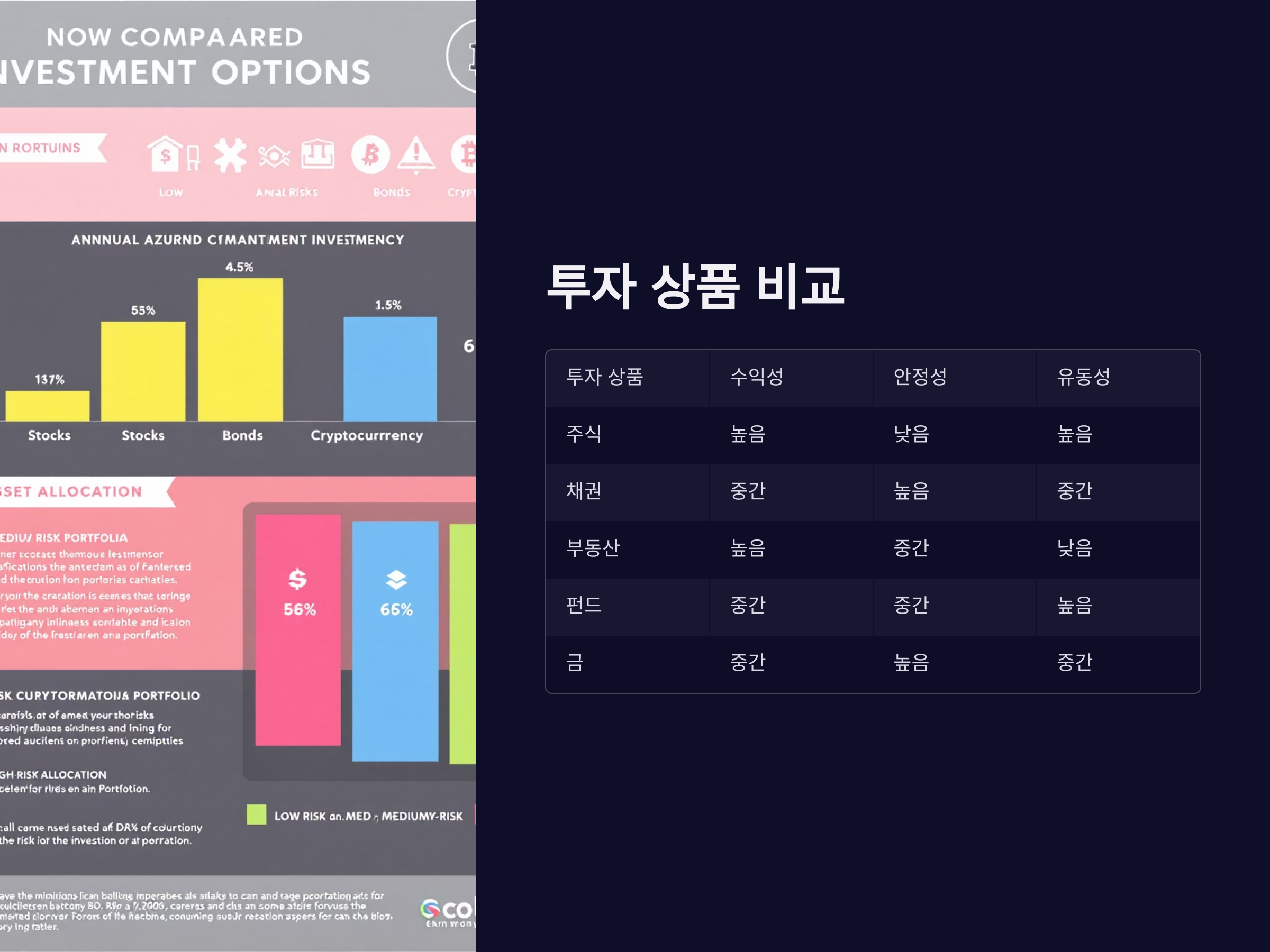 최근 저금리 시대가 계속되고 있으며, 많은 사람들이 안전한 투자처로 은행 예금을 고려하고 있습니다. 하지만 예금은 낮은 금리로 인해 실질적인 수익을 올리기 어렵고, 인플레이션을 따라잡기 힘든 경우가 많습니다. 그렇다면 은행 예금보다 더 나은 수익을 기대할 수 있는 투자 상품은 무엇일까요? 이번 글에서는 다양한 투자 상품을 소개하고, 각각의 장단점을 비교해보겠습니다.