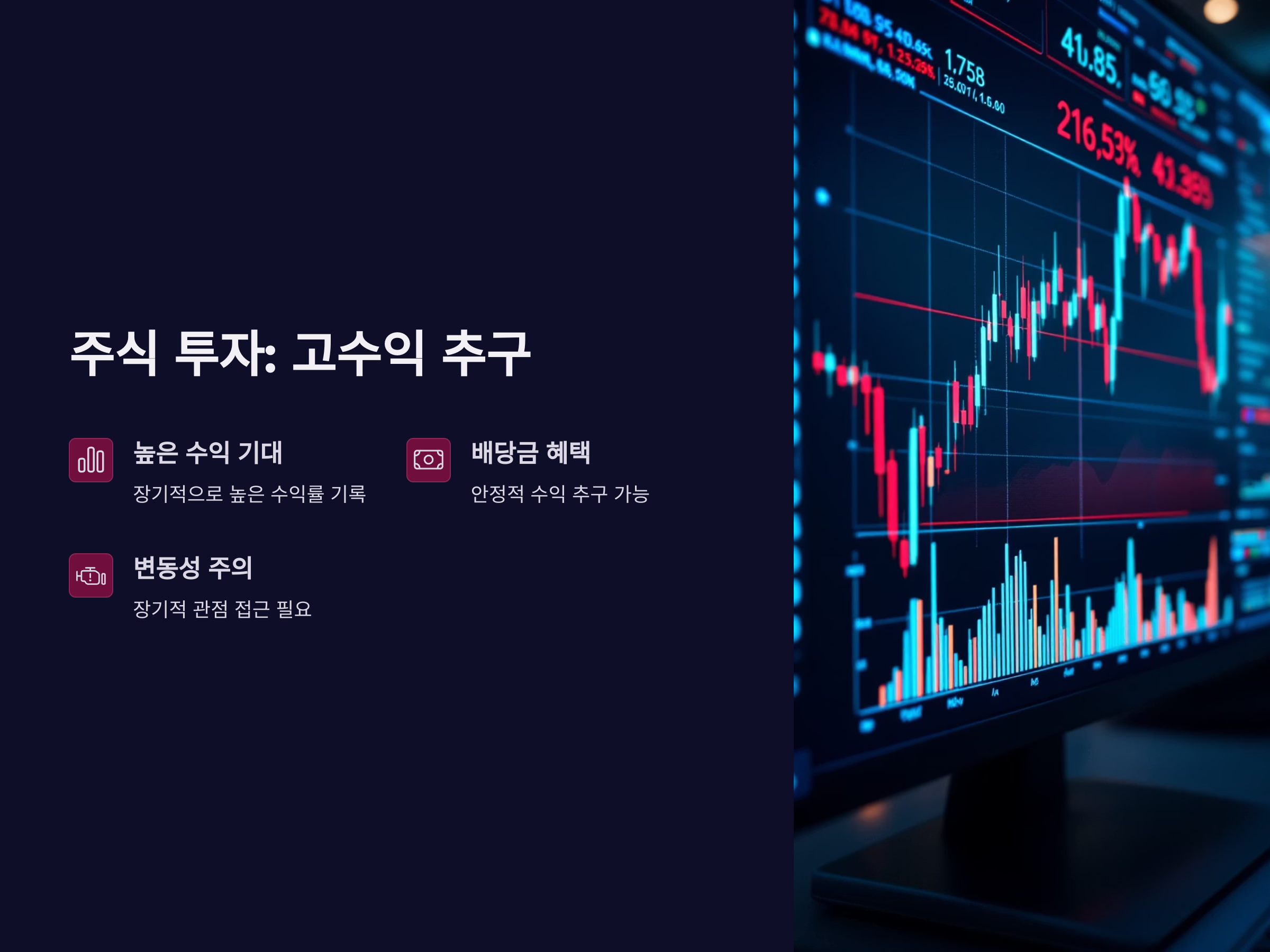 주식은 비교적 높은 수익을 기대할 수 있는 투자 상품입니다. 주식 시장은 기업의 실적이나 경제 전반의 흐름에 따라 가격이 변동하기 때문에 리스크도 존재하지만, 과거 데이터를 보면 장기적으로 높은 수익률을 기록한 종목들도 많습니다. 특히, 주식은 배당금을 받을 수 있기 때문에 안정적인 수익을 추구하는 투자자에게 유리할 수 있습니다.