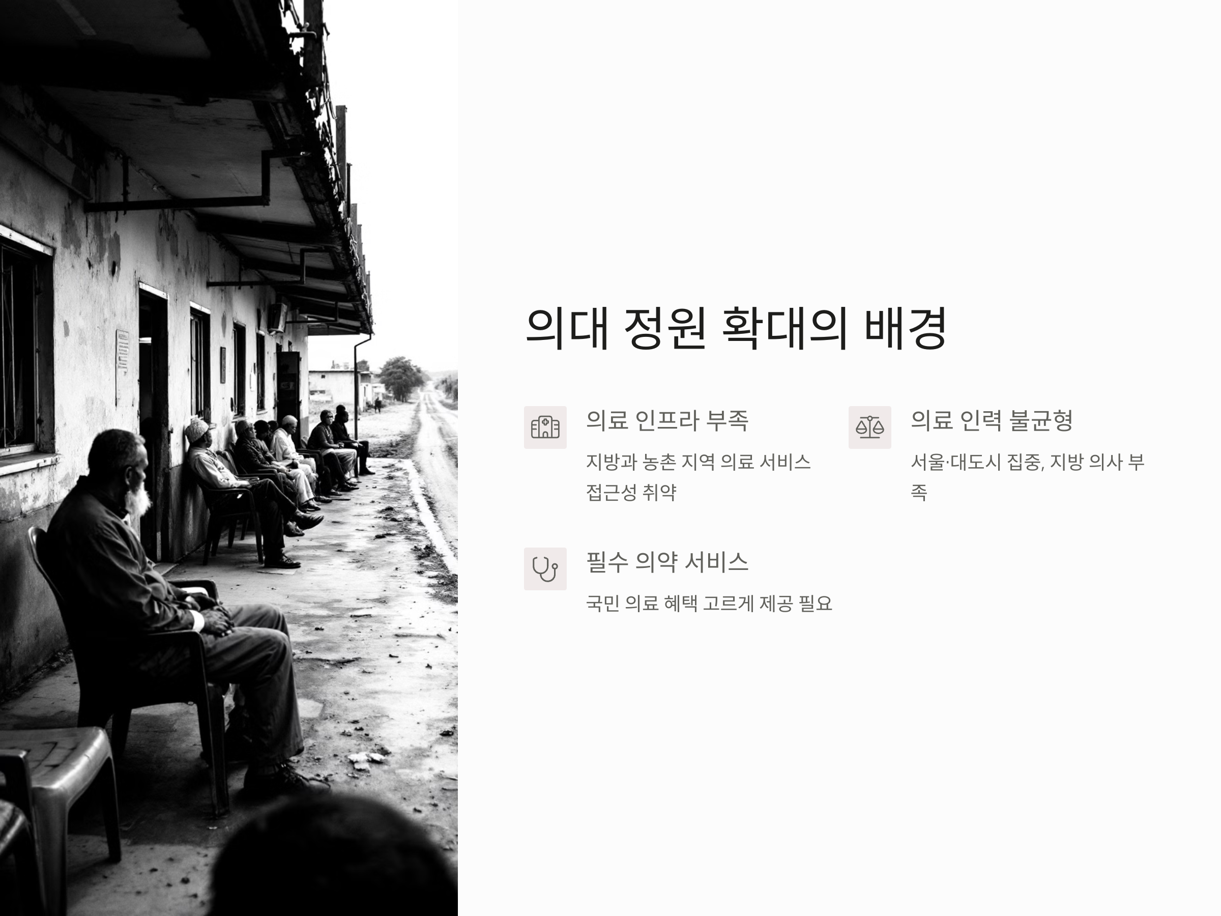 지방의료 격차를 해소하고, 필수적인 의약 서비스를 제공하기 위해서는 더 많은 의사를 양성할 필요가 있다는 주장입니다. 특히, 서울이나 대도시와 비교해 의료 인프라가 취약한 지역에서는 의사 수가 부족하여 국민들이 의료 혜택을 고르게 누리지 못하는 상황입니다. 이를 해결하려면 지역 의료 지원을 강화하기 위한 정책이 필요하며, 의대 정원 확대는 그 해결책 중 하나로 거론되고 있습니다.