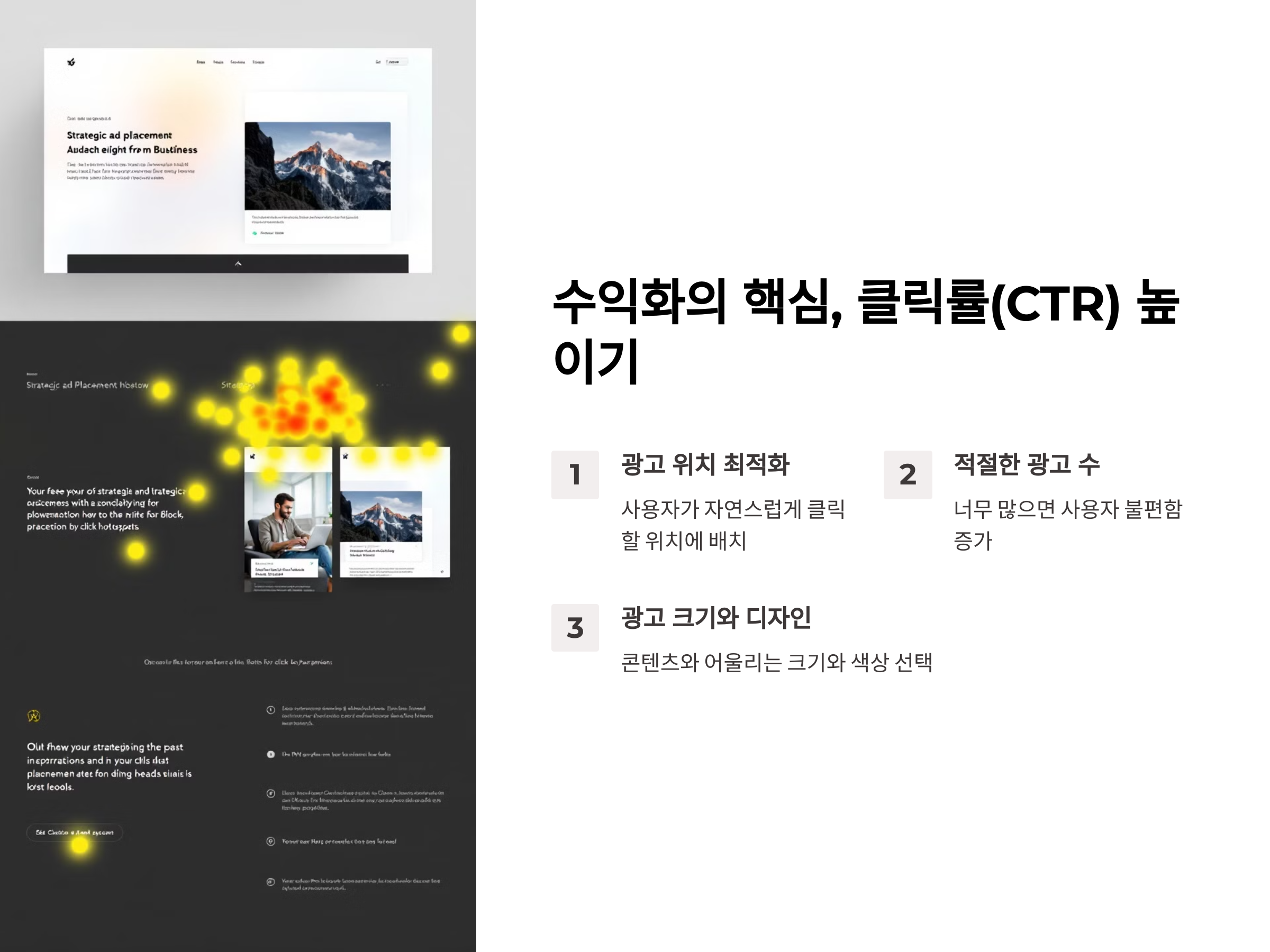 블로그에서 가장 중요한 것은 콘텐츠의 품질뿐만 아니라, 광고 클릭률(CTR)을 높이는 것입니다. 클릭률을 높이는 방법은 크게 두 가지로 나눌 수 있습니다. 첫 번째는 광고 위치입니다. 광고를 너무 많이 배치하면 오히려 사용자가 불편해져 클릭을 하지 않게 되므로, 적당히 배치하는 것이 중요합니다.