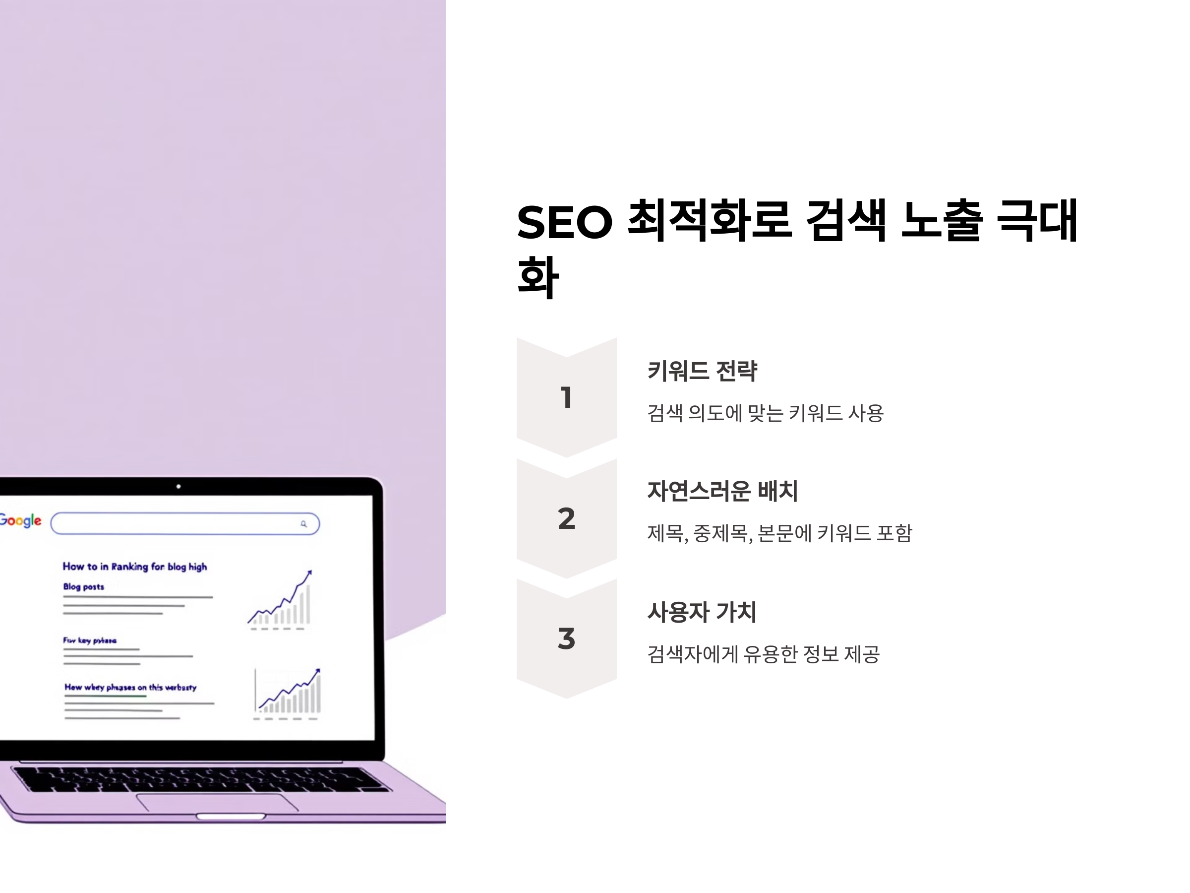 블로그 콘텐츠가 아무리 좋더라도, 검색엔진에서 상위에 노출되지 않으면 수익화가 불가능합니다. 구글 검색에서 상위에 노출되기 위해서는 SEO 최적화가 필수입니다. SEO 최적화에는 제목, 중제목, 본문 내용 등이 중요한 역할을 합니다.