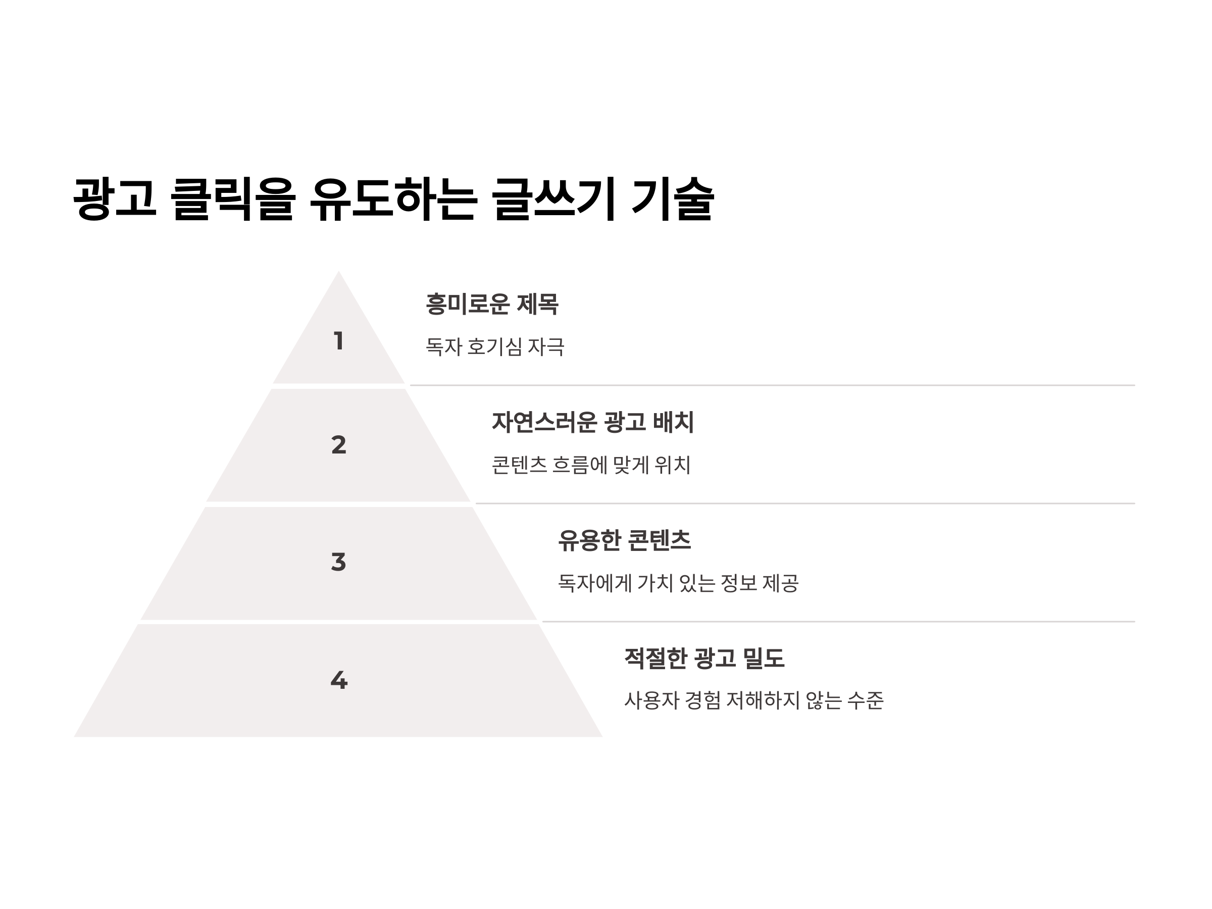 광고는 사용자가 글을 읽고 나서 자연스럽게 클릭할 수 있는 위치에 배치해야 합니다. 예를 들어, 중간에 광고를 삽입하면 글을 읽은 후 흥미를 가지게 되어 광고를 클릭할 확률이 높아집니다. 두 번째는 광고 크기와 디자인입니다. 너무 큰 배너형 광고는 오히려 눈에 거슬려 사용자가 클릭을 꺼리게 됩니다. 그 대신 콘텐츠와 잘 어울리는 광고 크기를 선택하고, 배경과 텍스트 색상도 글과 자연스럽게 어울리도록 설정하는 것이 클릭을 유도하는 데 큰 도움이 됩니다.