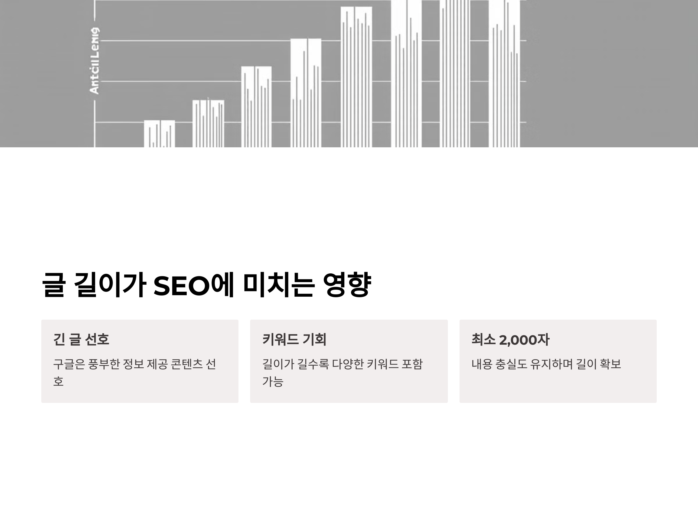 글의 길이가 SEO에 미치는 영향은 상당합니다. 짧은 글보다는 긴 글이 검색 엔진에서 더 좋은 평가를 받습니다. 구글은 더 많은 정보를 제공하는 콘텐츠를 선호하며, 길이가 길수록 더 많은 키워드와 관련 정보를 포함할 수 있기 때문에 검색 상위에 노출될 가능성이 높아집니다.