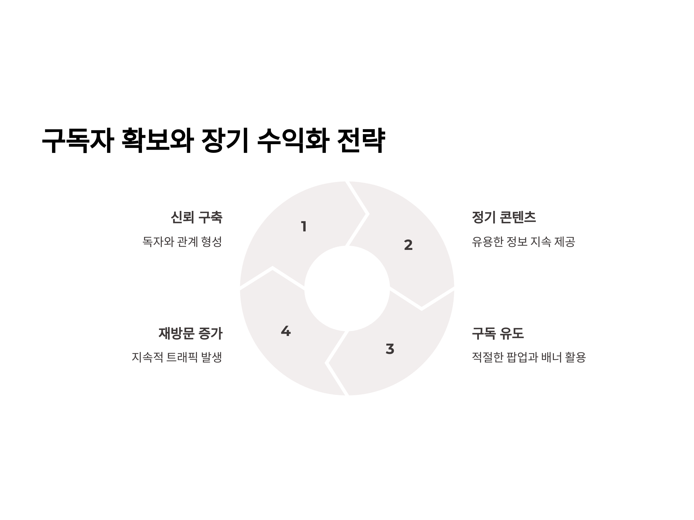 정기적으로 유용한 콘텐츠를 제공하고, 독자들이 관심을 가질 만한 주제를 다루는 것이 필요합니다. 예를 들어, 블로그 수익화에 관련된 깊이 있는 자료나 실전 팁을 제공하면 독자들이 자연스럽게 구독할 확률이 높습니다. 또한, 구독을 유도하는 팝업창이나 배너를 적절히 배치하여, 구독자 수를 늘려가는 것이 효과적입니다.