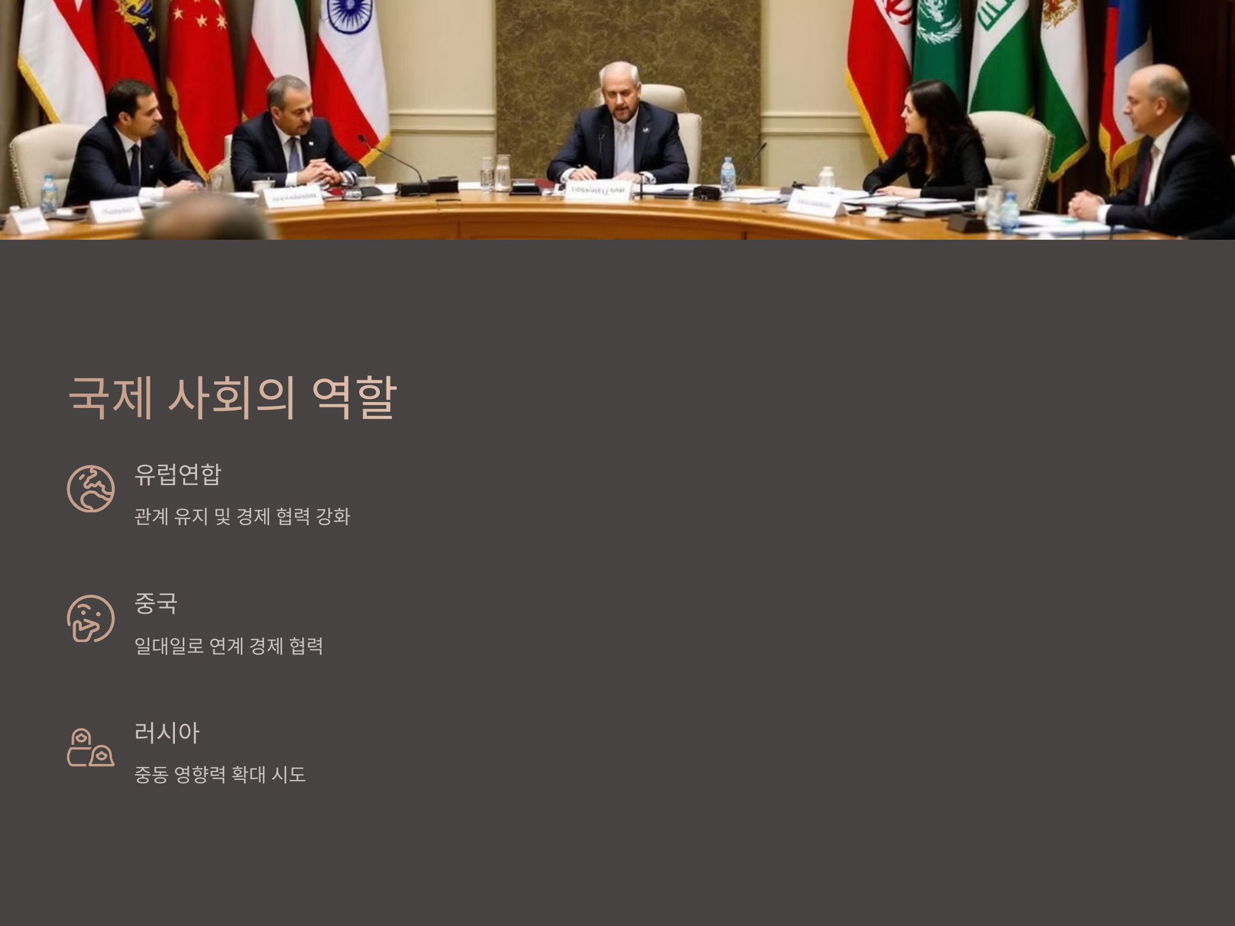 협상 재개에 대한 국제 사회의 반응은 긍정적입니다. 특히, 유럽연합(EU)과 중국은 이란과의 핵 협상에 큰 관심을 보이며, 이를 통한 중동 지역의 안정화를 원하는 입장을 표명했습니다. 유럽연합은 이란과의 관계를 유지하고 경제적으로도 협력을 강화하고자 하는 의지가 강합니다. 중국은 이란과의 경제적 협력을 통해 자국의 일대일로 프로젝트에도 긍정적인 영향을 미치길 원하고 있습니다.