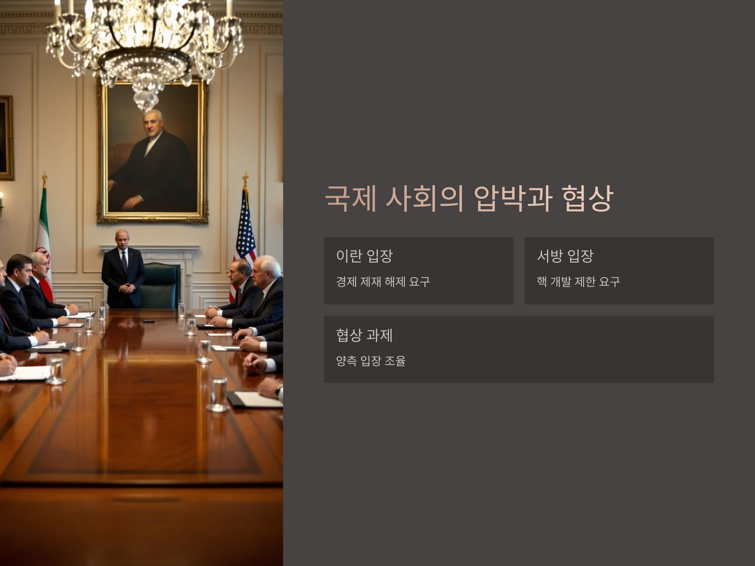 최근 몇 달간의 국제 회의와 협상에서 보여준 양측의 입장 차이, 그리고 새로운 경제 제재와 관련된 논의가 중요한 이슈로 떠오르고 있습니다. 이란은 경제 제재 완화를 원하고 있으며, 서방 국가들은 이란의 핵 활동 제한을 위해 더욱 엄격한 조건을 제시하고 있습니다. 그럼에도 불구하고, 협상 재개는 국제 사회에서 긍정적인 신호로 해석되고 있으며, 이는 중동의 안정화와 국제 정치에 미칠 영향이 적지 않을 것으로 보입니다.