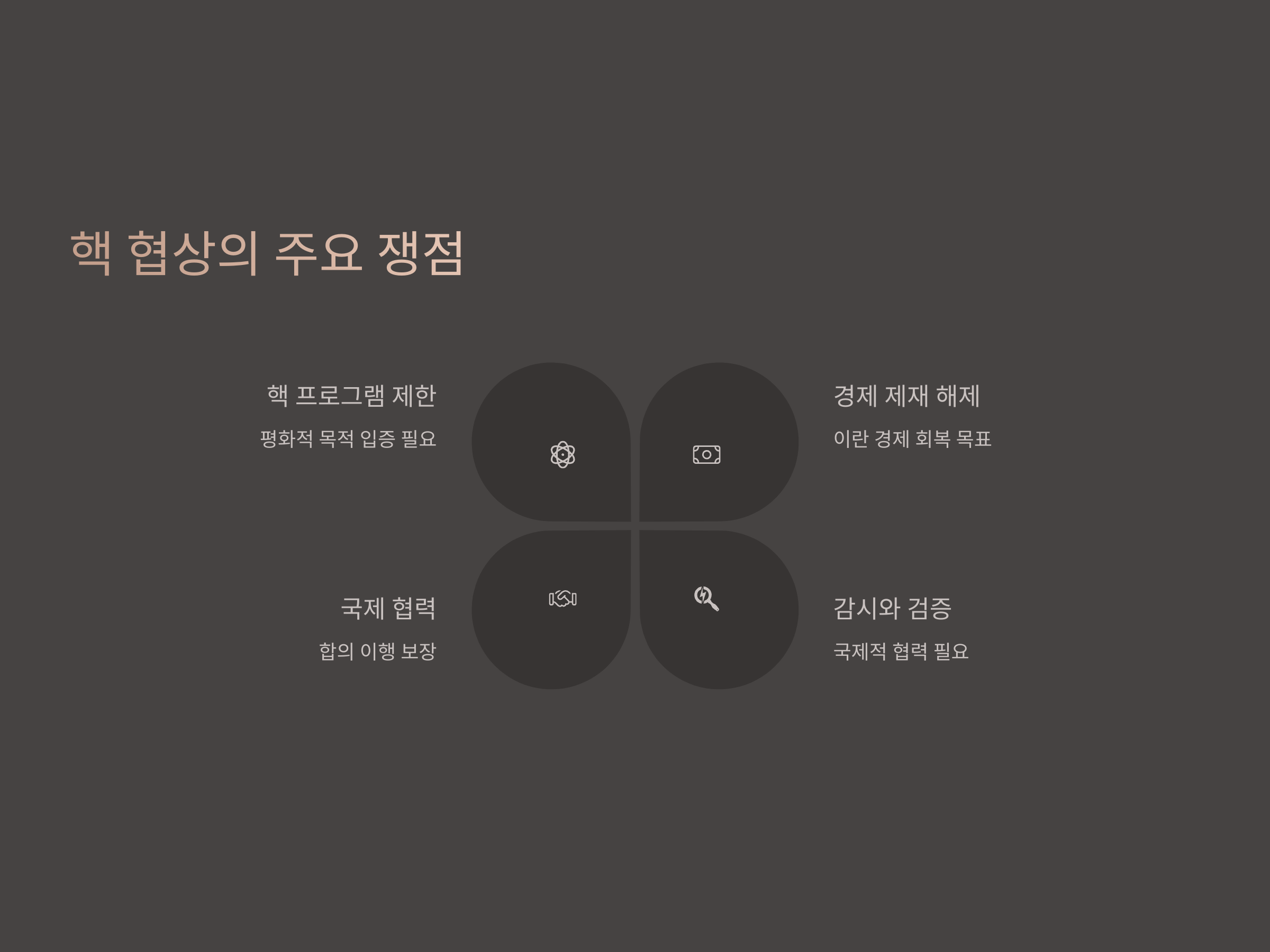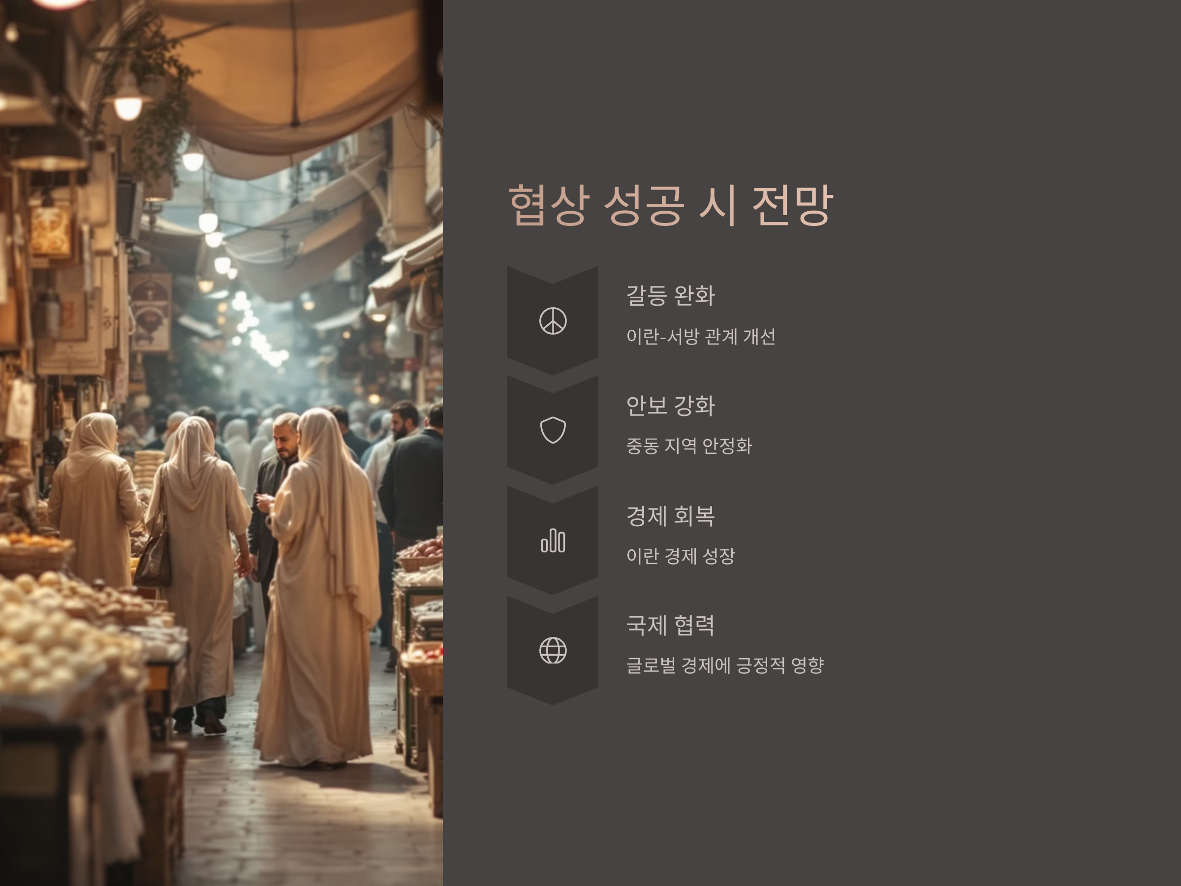 이란은 핵 프로그램의 평화적 목적을 주장하면서도, 핵 합의에서 요구된 모든 사항을 충족시키기 위한 협력에 대한 의지가 명확히 드러나지 않은 상태입니다. 이는 협상의 지연과 긴장을 초래하는 요소로 작용하고 있습니다. 또한, 미국의 제재와 EU의 제재가 이란 경제에 미친 영향은 상당히 크며, 이란의 주요 경제 분야가 제재로 인해 어려움을 겪고 있습니다. 협상이 성공적으로 이루어질 경우, 이란 경제의 회복과 함께 국제 사회와의 협력이 더욱 확대될 것으로 보입니다.