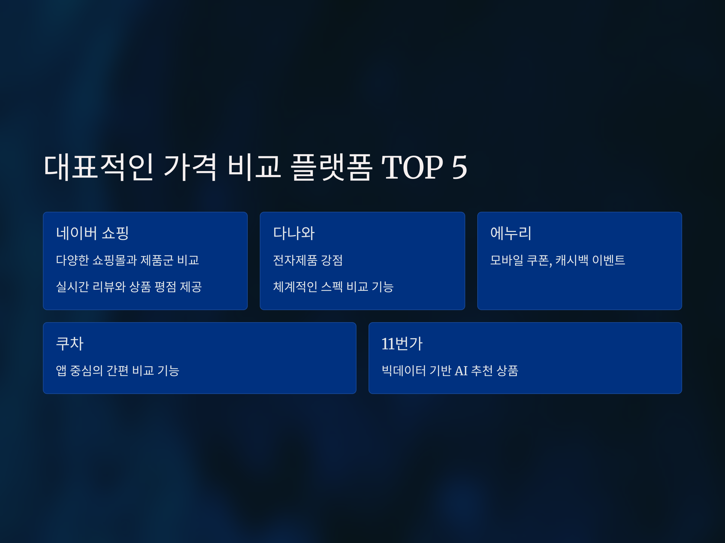 국내에서 가장 많이 사용하는 가격 비교 플랫폼은 네이버 쇼핑, 다나와, 에누리, 쿠차, 그리고 11번가 쇼핑포털입니다. 이 플랫폼들은 각기 다른 강점을 가지고 있기 때문에 상황에 따라 병행해서 활용하는 것이 좋습니다.