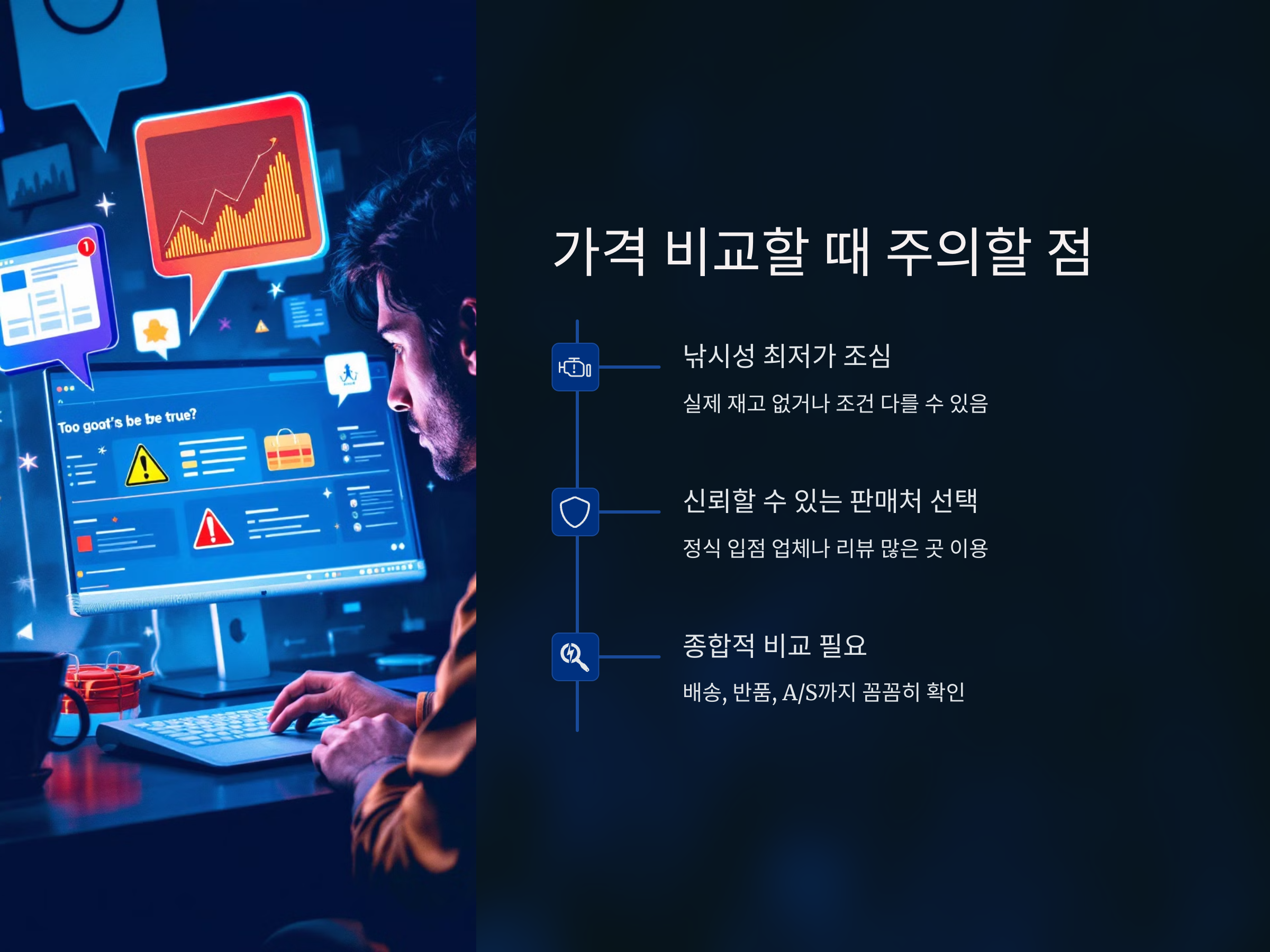 가격 비교 사이트를 제대로 활용하려면 단순히 최저가만 보고 구매 결정을 내려서는 안 됩니다. 가장 먼저 고려해야 할 것은 '신뢰도 높은 판매자'인지 확인하는 것입니다. 일부 판매자는 최저가만 표시해 놓고 실제 구매 시 추가 옵션 비용이나 높은 배송비를 부과하는 경우가 있기 때문입니다.