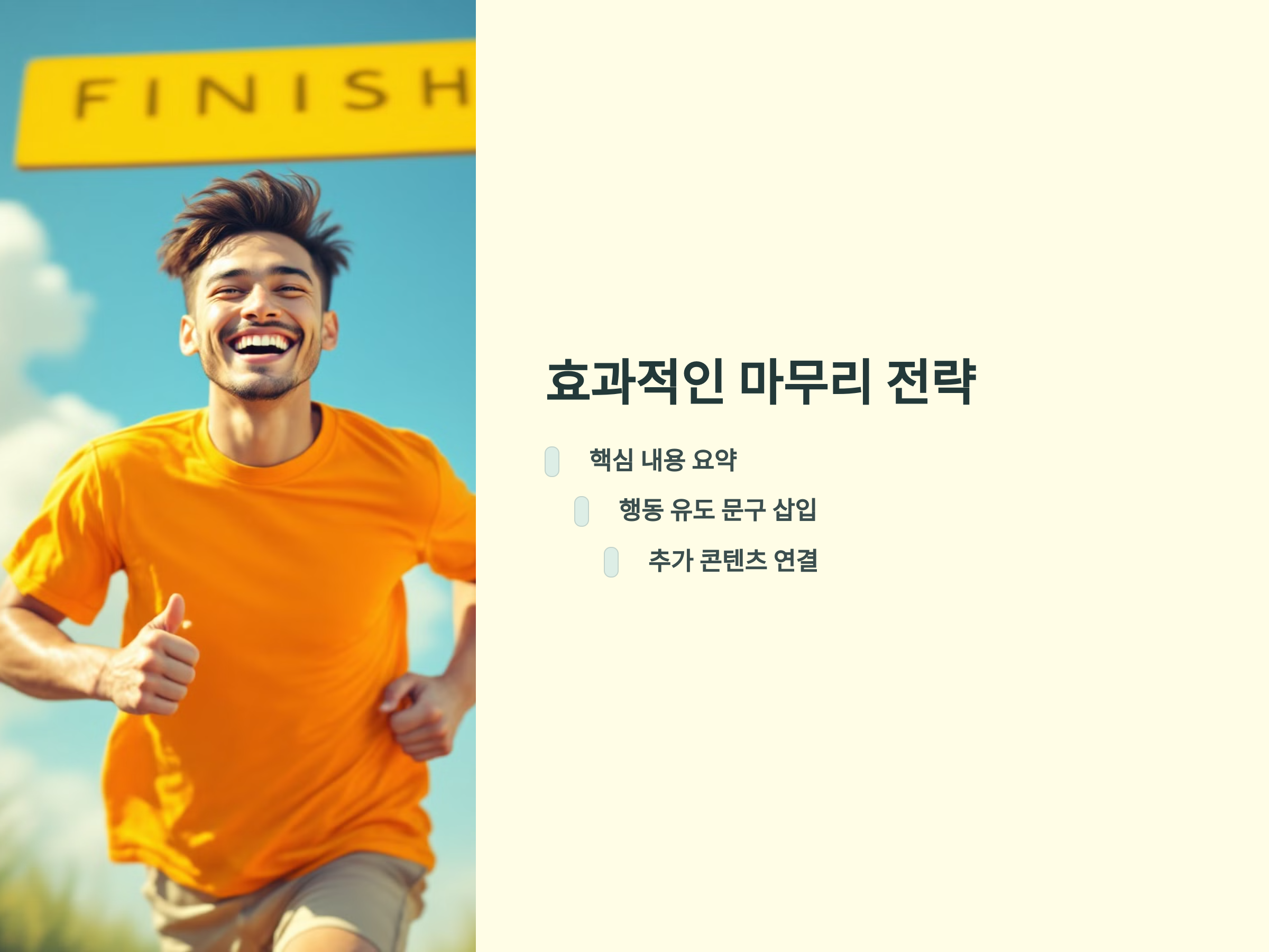 블로그 글을 마무리할 때, 독자들이 행동을 취할 수 있도록 유도하는 것이 중요합니다. 예를 들어, 글을 끝낸 후 "더 자세히 알고 싶다면 이 링크를 클릭해 보세요" 또는 "이 글이 도움이 되셨다면, 댓글로 의견을 남겨주세요"와 같이 독자들에게 다음 행동을 유도