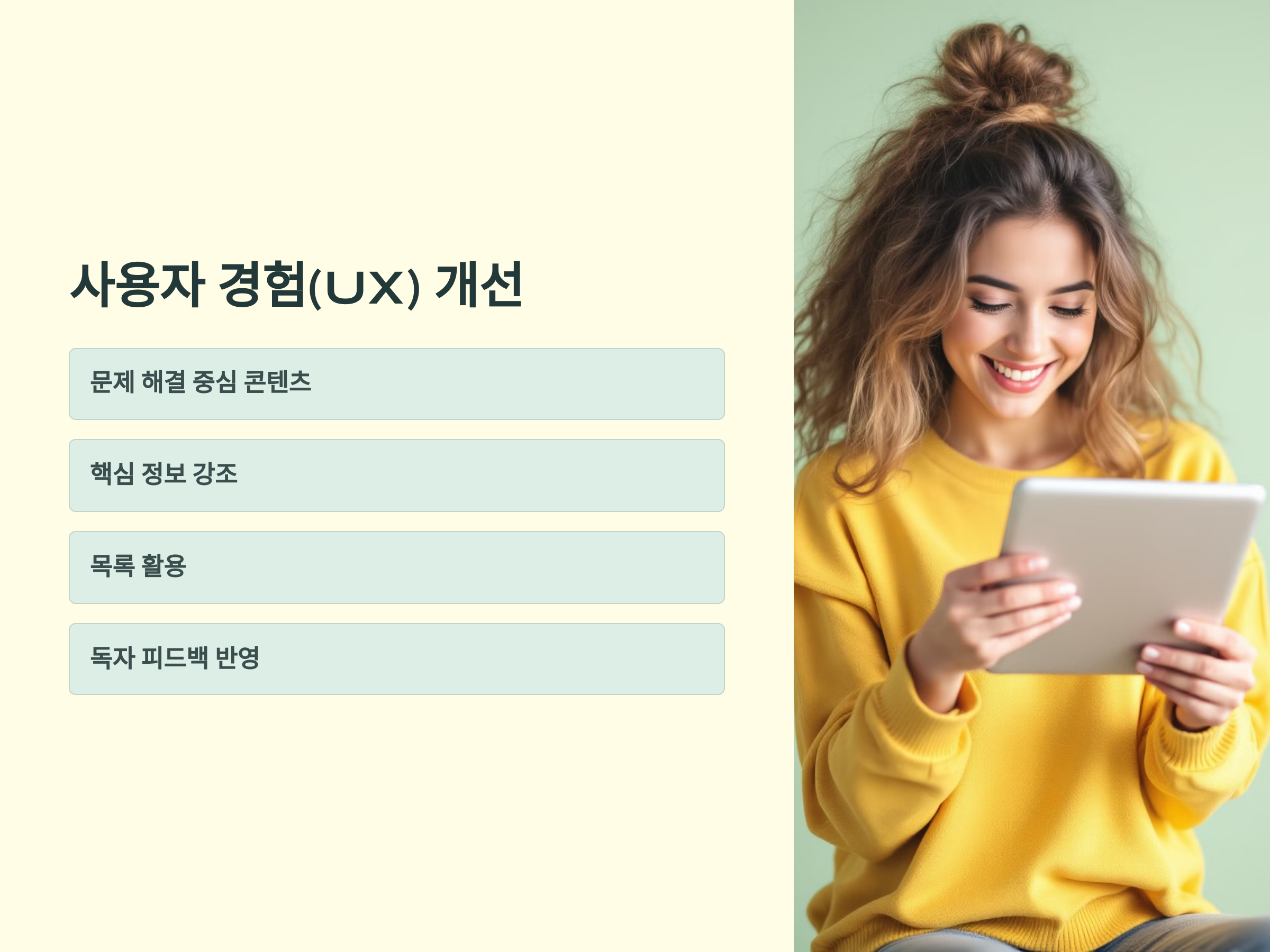 SEO 최적화도 중요하지만, 결국 블로그 글을 작성하는 가장 중요한 목적은 독자가 만족하고 유용한 정보를 얻는 것입니다. 독자의 만족도를 높이는 방법 중 하나는 바로 사용자의 경험(UX)을 고려한 글을 쓰는 것입니다. 사용자가 글을 읽고 싶어 하는 이유는 단순히 정보 습득뿐만 아니라, 그들이 직면한 문제를 해결하기 위함입니다.