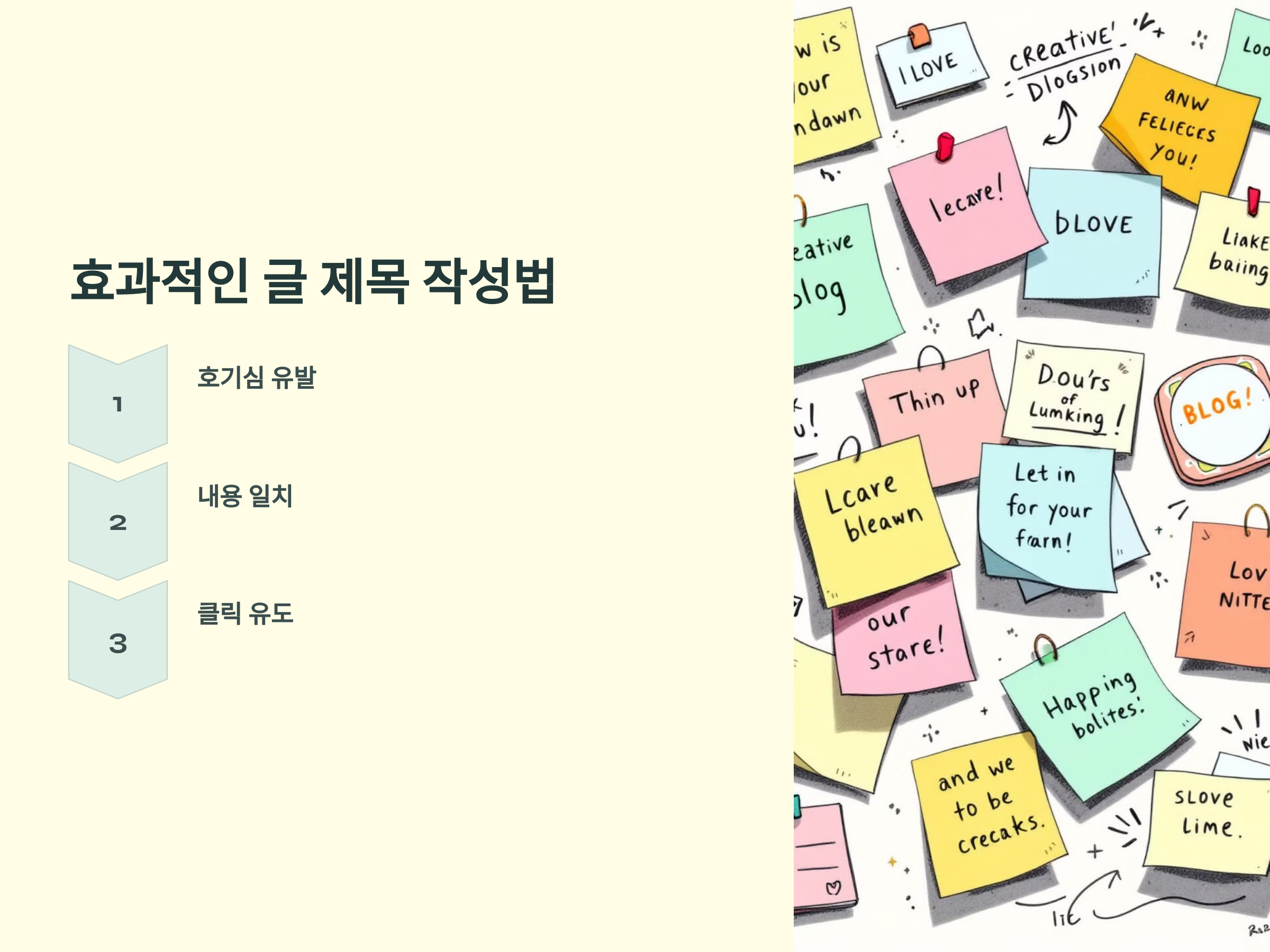 블로그 글을 작성할 때 가장 먼저 신경 써야 할 부분은 바로 제목입니다. 제목은 첫인상과도 같아서, 사람들이 내 글을 클릭할지 말지 결정짓는 중요한 요소입니다. "이 방법을 몰랐다면 큰일 날 뻔!"과 같은 자극적인 제목은 자연스럽게 사람들의 호기심을 자극합니다. 하지만 주의해야 할 점은, 제목과 본문 내용이 일치해야 한다는 것입니다. 제목을 자극적으로 만들지만, 글 내용이 그에 미치지 못하면 독자들은 실망하고 블로그에서 이탈하게 됩니다.