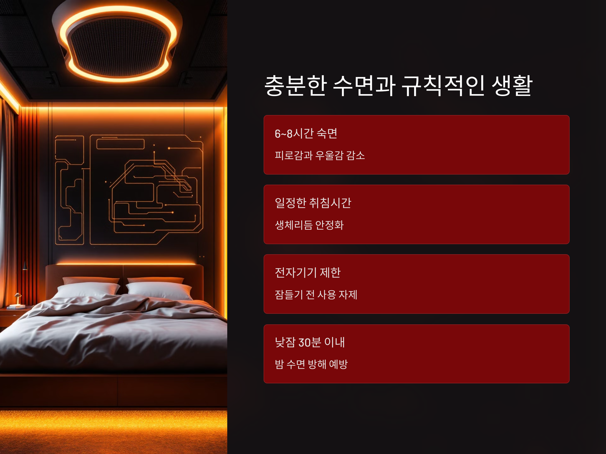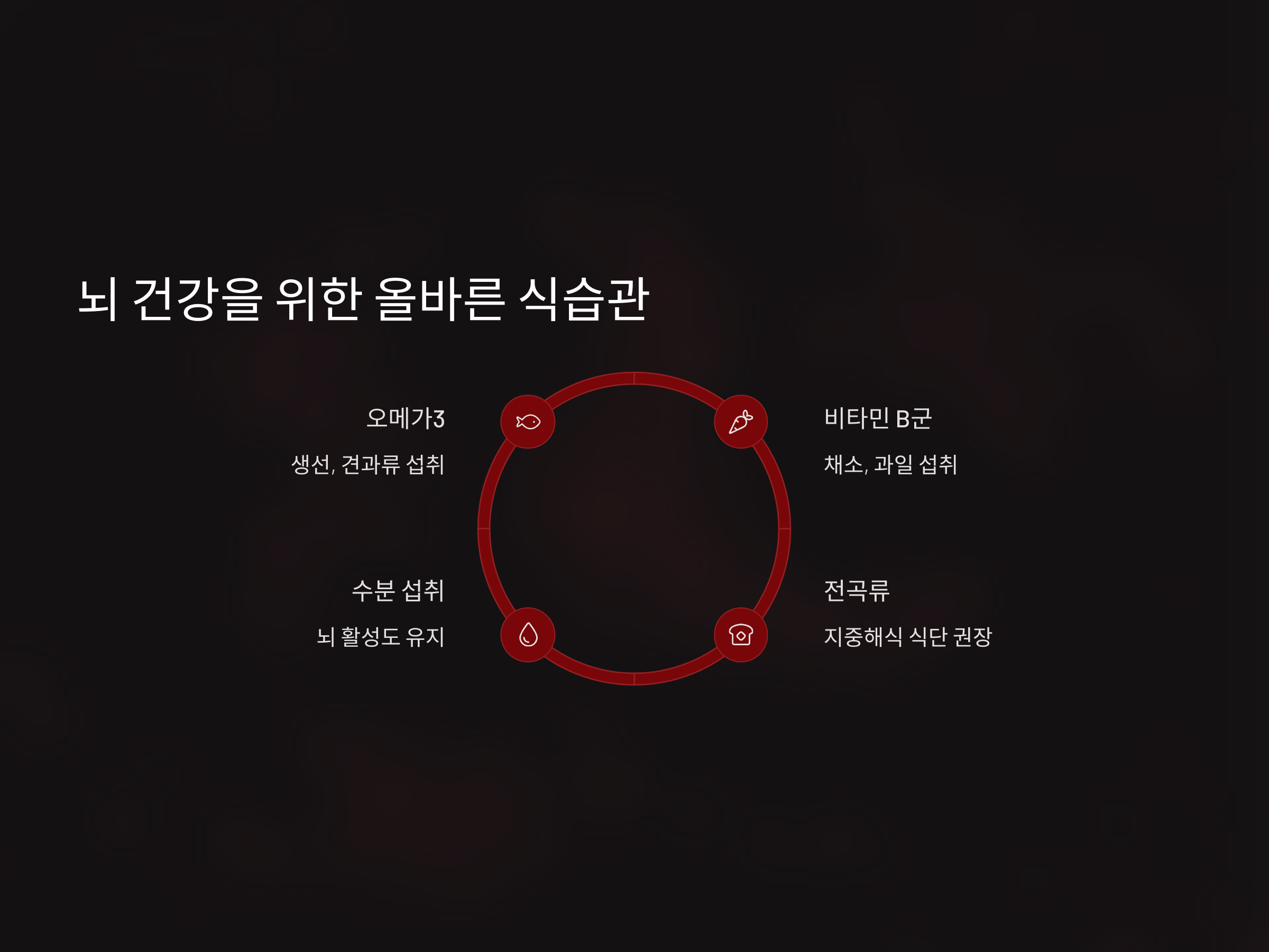 카페인과 알코올은 가능한 줄이고, 수분 섭취를 충분히 하여 몸의 순환과 뇌의 활성도를 유지하는 것이 좋습니다. 특히 아침 식사는 거르지 말고, 하루 세끼를 규칙적으로 챙겨 먹는 습관을 들이는 것이 중요합니다.