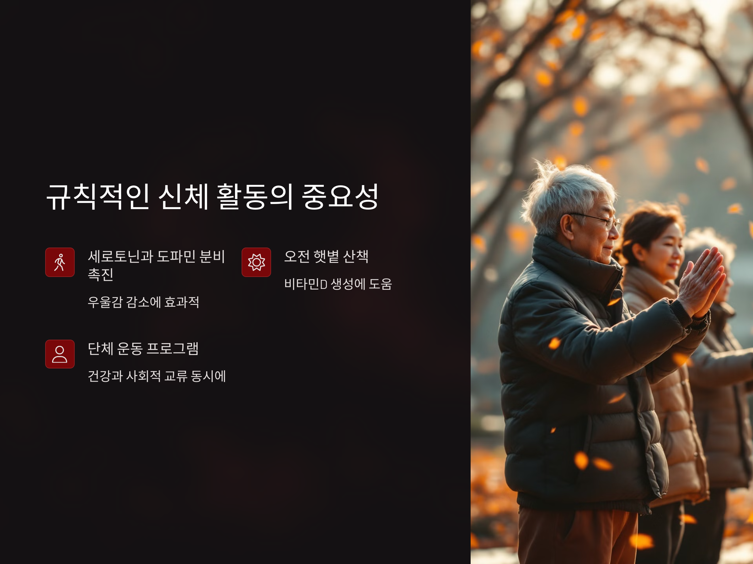 적절한 운동은 기분을 좋게 만드는 세로토닌과 도파민의 분비를 촉진시켜 우울감을 줄이는 데 탁월한 효과가 있습니다. 노인들에게 적합한 운동으로는 걷기, 가벼운 스트레칭, 실버 요가, 수중 운동 등이 있습니다. 특히 오전에 햇볕을 받으며 걷는 산책은 비타민D 생성에도 도움을 줘 기분 전환에 좋습니다.