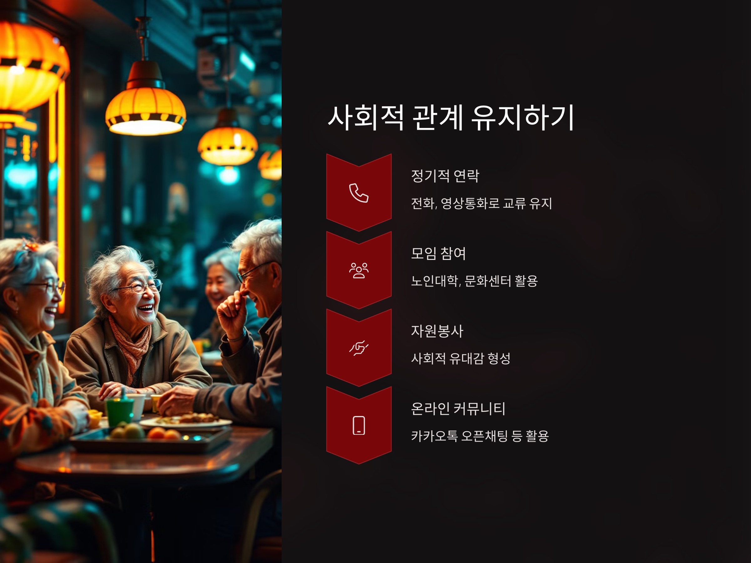 고립은 노인 우울증의 가장 큰 원인 중 하나입니다. 친구, 가족, 이웃과 정기적으로 연락을 유지하는 것이 중요합니다. 전화통화, 주기적인 만남, 온라인 영상통화 등을 활용하여 정서적 교류를 지속하세요. 또한 노인대학, 지역 문화센터, 자원봉사 활동 등도 사회적 유대감을 높이는 좋은 수단입니다.