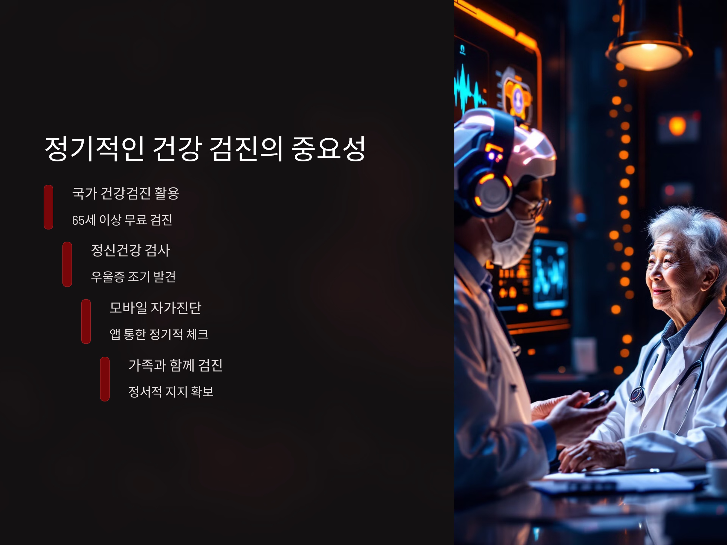 우울증은 조기 발견이 무엇보다 중요합니다. 65세 이상 노인은 국가에서 제공하는 정기 건강검진 외에도 치매 및 정신 건강 검진을 받을 수 있습니다. 특히 최근에는 모바일 앱을 통한 정신건강 자가진단 기능도 확대되고 있어 활용도가 높아지고 있습니다.