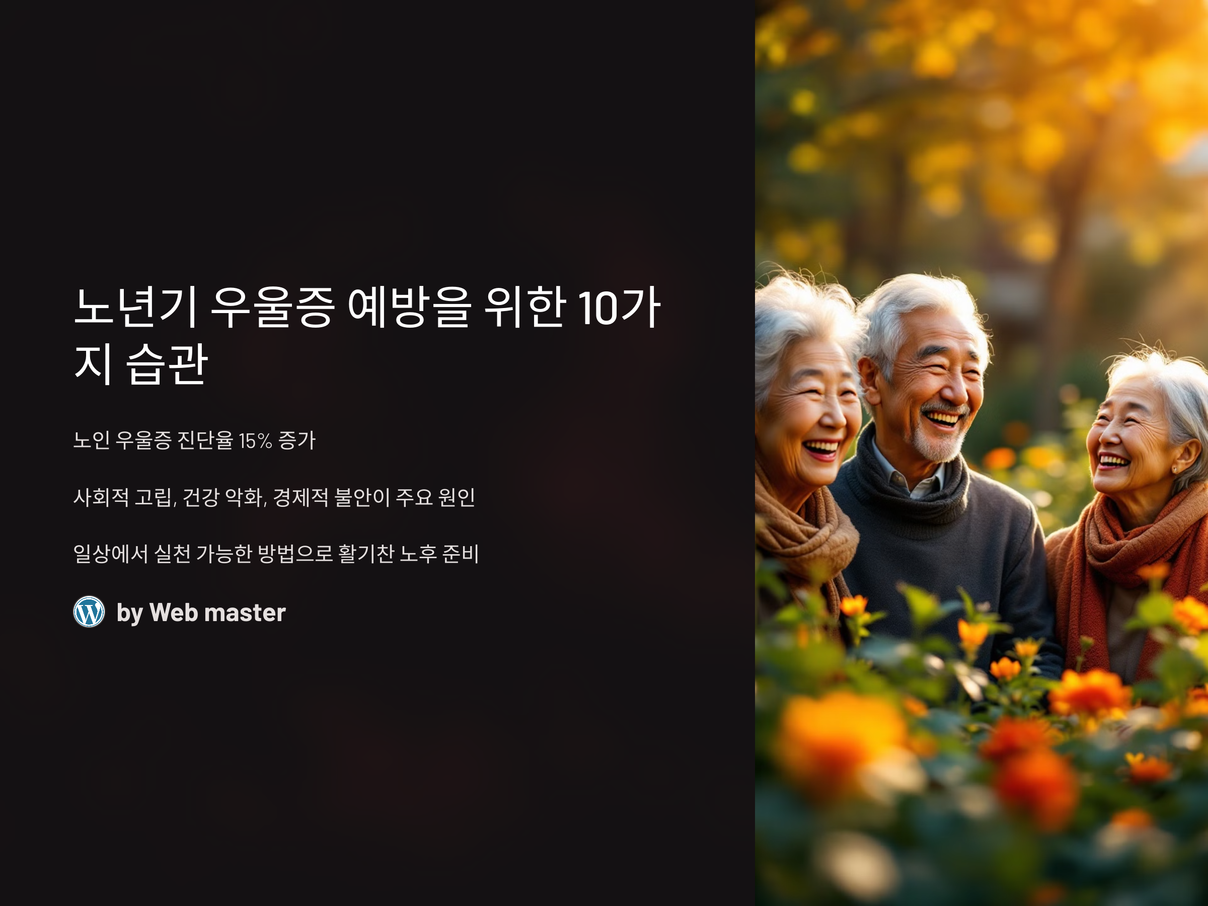 이 글에서는 일상에서 실천할 수 있는 '노인 우울증을 예방하는 10가지 방법'을 소개하며, 노년기 삶의 질을 높이는 실질적인 팁을 제공합니다. 이 방법들을 생활에 적용하면 외로움과 우울감에서 벗어나 더 건강하고 활기찬 노후를 보내는 데 도움이 될 것입니다.