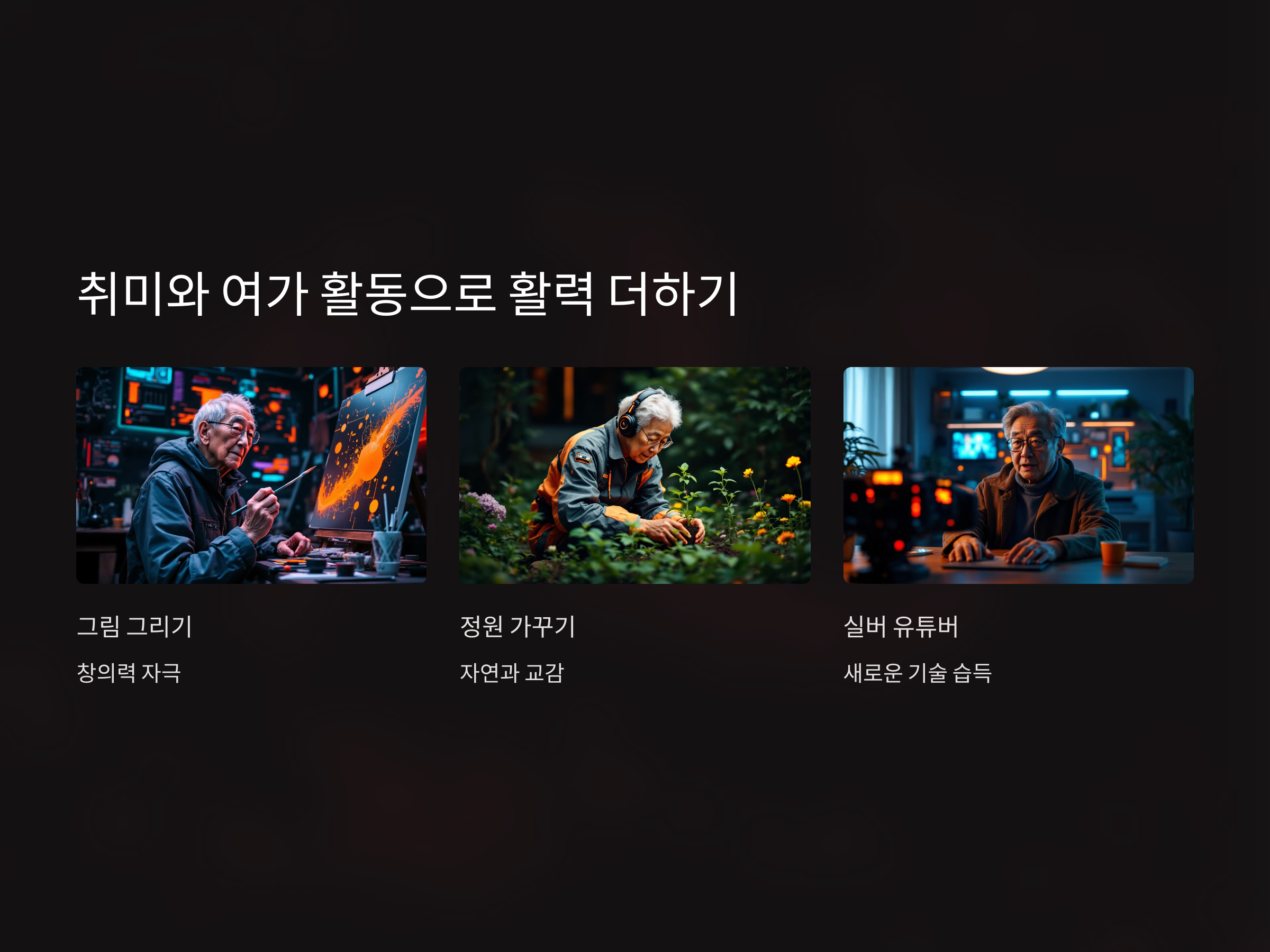 하루 일과 중 일부 시간을 좋아하는 취미에 투자해 보세요. 그림 그리기, 악기 연주, 글쓰기, 뜨개질, 정원 가꾸기 등은 집중력과 창의력을 자극하며 스트레스를 줄여주는 역할을 합니다. 최근에는 실버 유튜버 활동이나 디지털 드로잉처럼 새로운 기술을 익히는 것도 우울감 예방에 매우 효과적인 방법으로 주목받고 있습니다.
