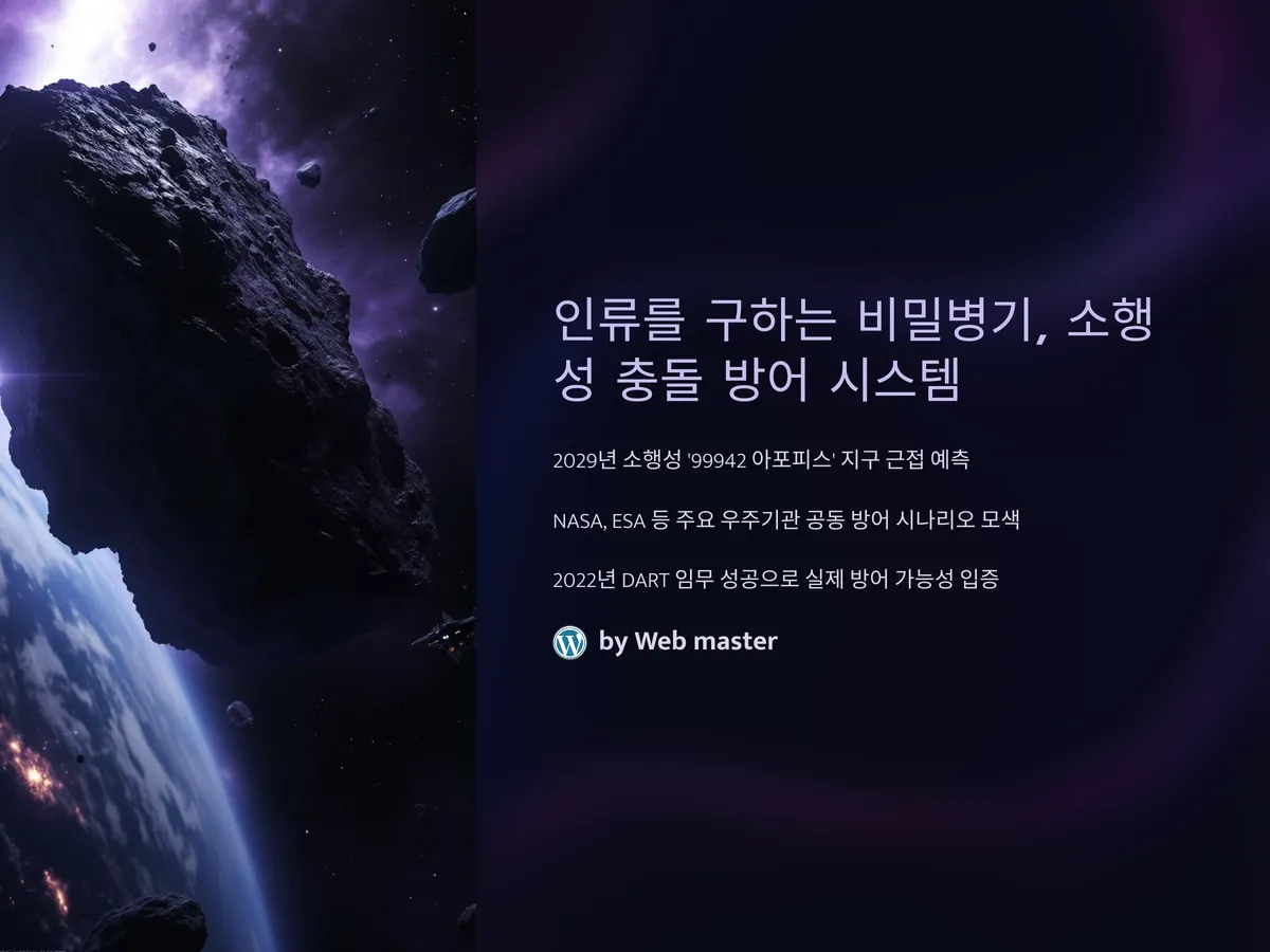 2029년, 소행성 ‘99942 아포피스’가 지구에 근접할 것으로 예측되면서 전 세계적으로 소행성 충돌 방어 시스템에 대한 관심이 폭증하고 있습니다. 미국 NASA와 유럽 ESA를 비롯한 주요 우주기관들이 이례적으로 공동 방어 시나리오를 모색하고 있고, 2022년 NASA의 DART 임무 성공 이후 ‘실제 방어 가능성’이 입증되면서 과학계뿐만 아니라 정책, 산업 전반에서 새로운 기술 패러다임이 도래하고 있습니다. 이제는 단순한 이론이 아닌, 실질적인 ‘우주 국방’ 체계로 소행성 방어 기술이 격상되고 있는 상황입니다. 특히 자율항법, AI 기반 궤도 예측, 핵분열 에너지 이용 타격 시스템 등의 신기술들이 적용되고 있으며, 이는 민간 우주산업 성장과도 직결되어 ‘우주 안보 산업’으로 주목받고 있습니다.