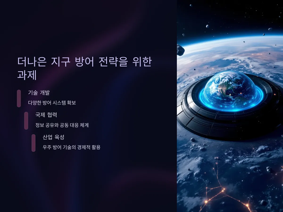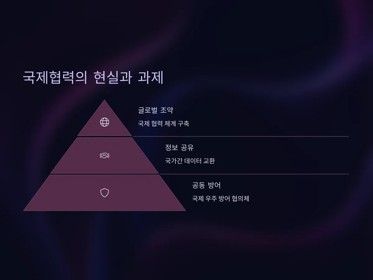 그러나 현실은 복잡하다. 국가별 우주 기술 격차와 국방 전략 차이, 정보 공유의 한계로 인해 실질적인 공동 방어 시스템은 아직 구축되지 못한 상황이다. 특히 군사 기술로의 전용 가능성이 있다는 우려로, 민간 협력보다는 국가 중심의 폐쇄적 구조가 강하다. 향후 이를 조율할 글로벌 조약과 기술적 신뢰 확보가 관건이 될 것이다.