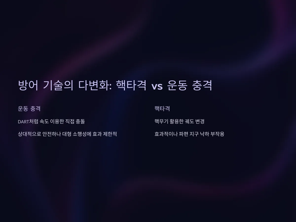 현재 소행성 방어 시스템은 크게 두 가지 축으로 연구된다. 첫째는 운동 충격(Kinetic Impactor), 즉 DART처럼 속도를 이용한 직접 충돌 방식이다. 둘째는 핵무기 또는 고에너지 무기를 활용한 궤도 변경 방식이다. 후자는 영화에서나 가능할 것 같지만, 실제로 러시아와 미국은 극비리에 핵기반 소행성 요격 시나리오를 개발해온 바 있다.