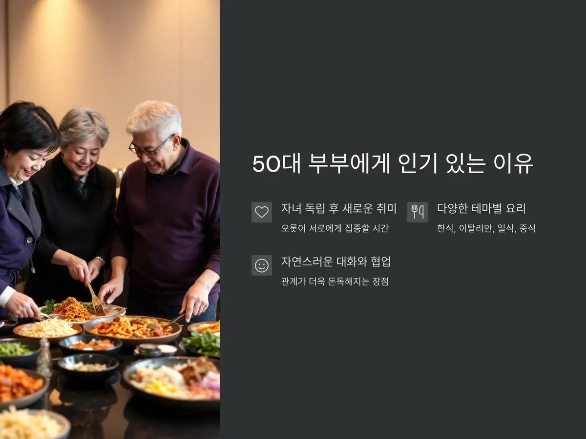 50대 이후는 대부분 자녀가 독립하거나 은퇴를 준비하는 시기입니다. 이 시점에서 부부는 오롯이 서로에게 집중할 시간이 많아지며, 새로운 공통의 취미를 찾는 것이 중요해집니다. 요리 클래스는 이런 부부에게 최적의 활동으로, 함께 요리를 하면서 자연스럽게 대화와 협업이 이뤄지며 관계가 더욱 돈독해지는 장점이 있습니다.