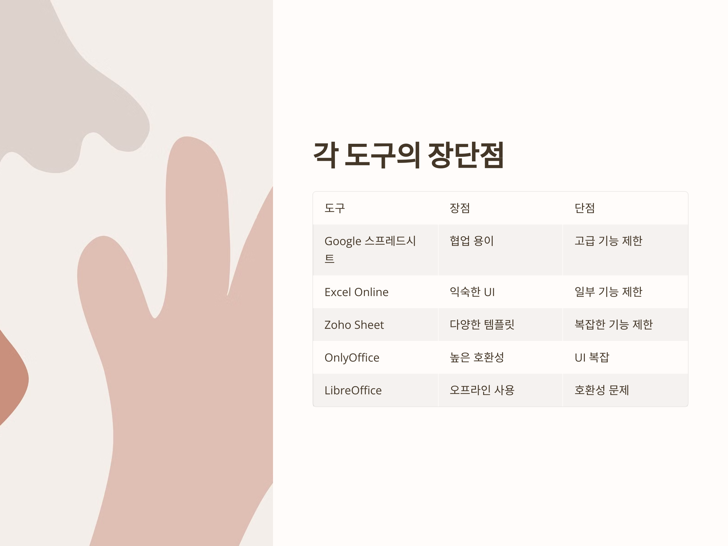 단점은, 무료 버전에서는 일부 고급 기능이 제한될 수 있으며, 인터넷이 연결된 상태에서만 사용 가능하다는 점입니다. 다만, 기본적인 엑셀 사용을 위한 편집은 충분히 가능합니다.
