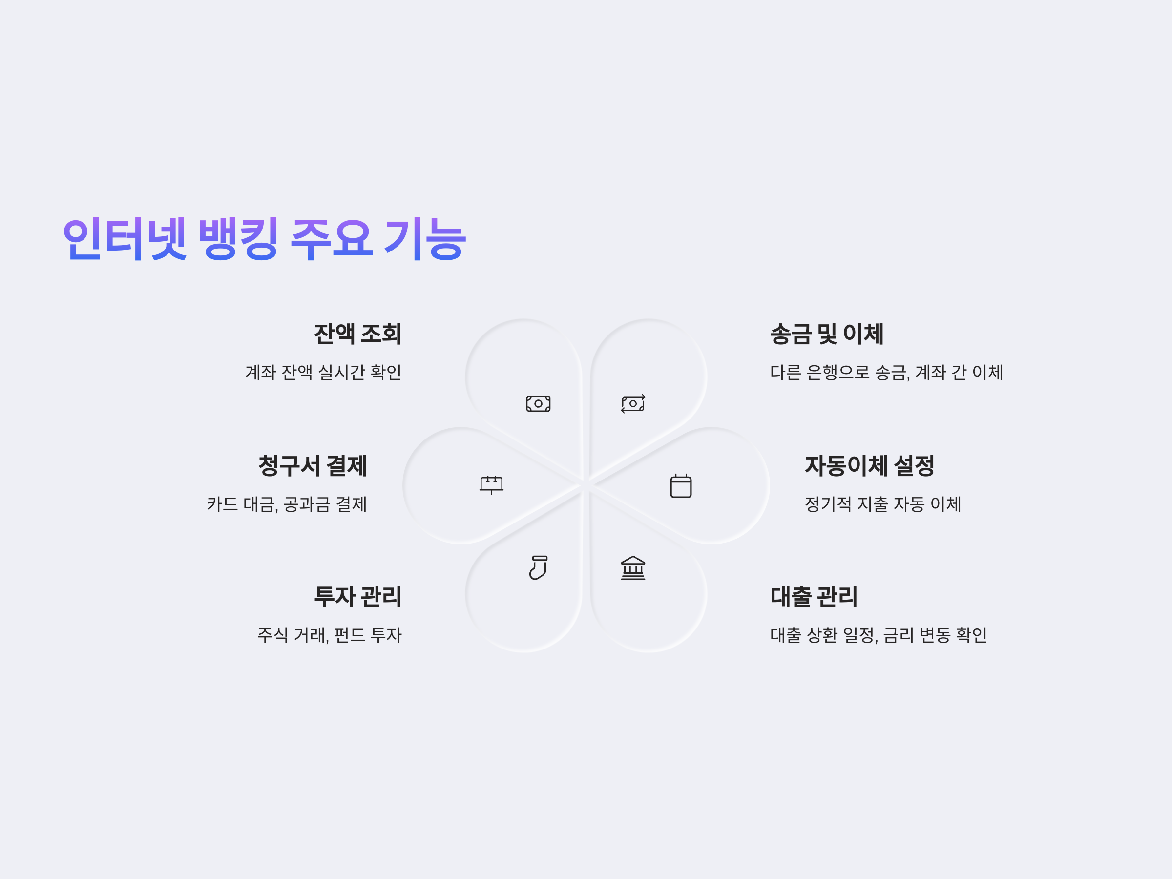- 청구서 및 카드 대금 결제: 카드 대금이나 공과금 등의 청구서를 인터넷 뱅킹에서 직접 결제할 수 있습니다.