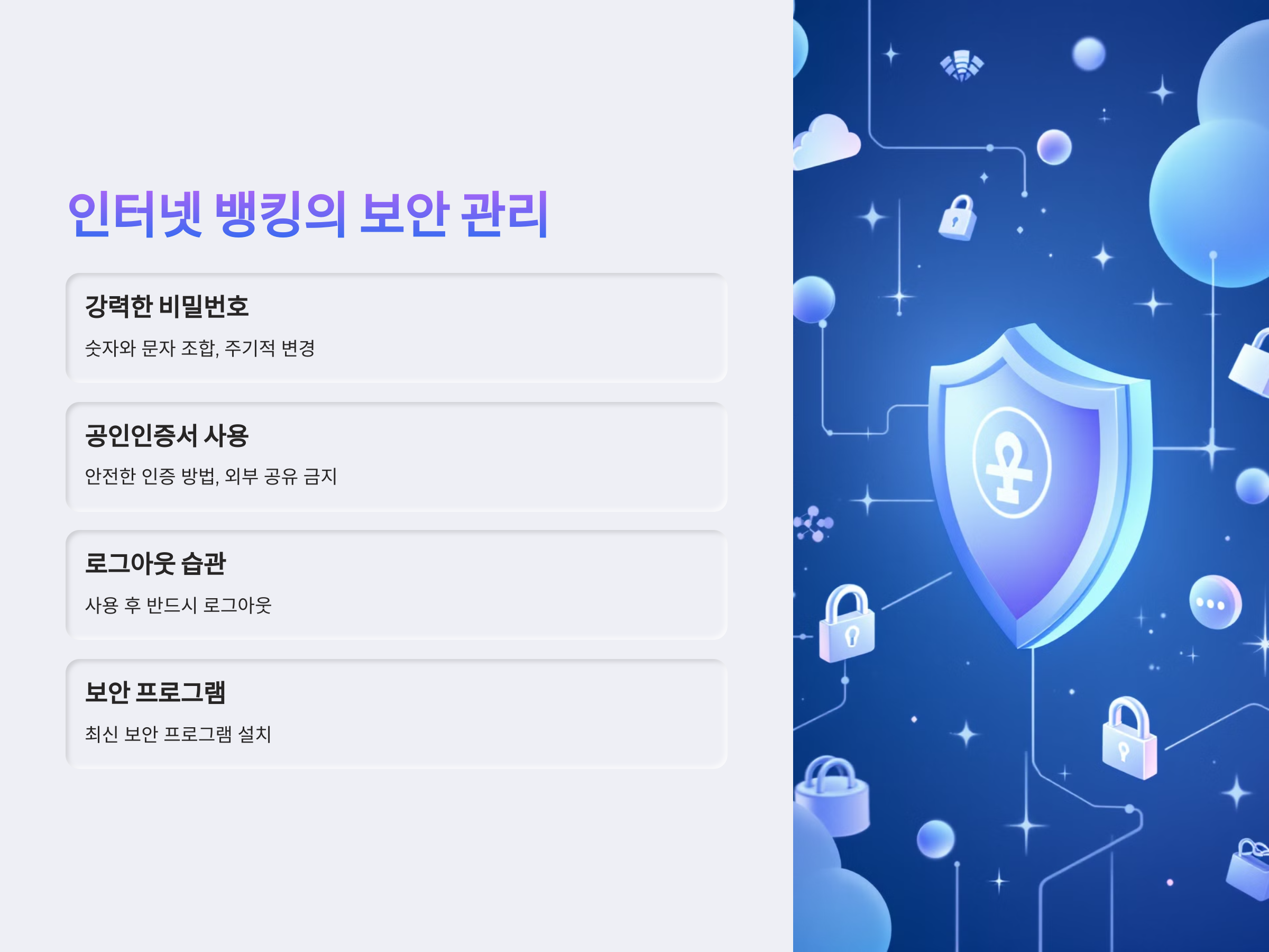 인터넷 뱅킹을 사용할 때 가장 중요한 것은 보안입니다. 개인정보와 금융 자산을 보호하기 위해서는 몇 가지 보안 관리 방법을 철저히 지켜야 합니다.