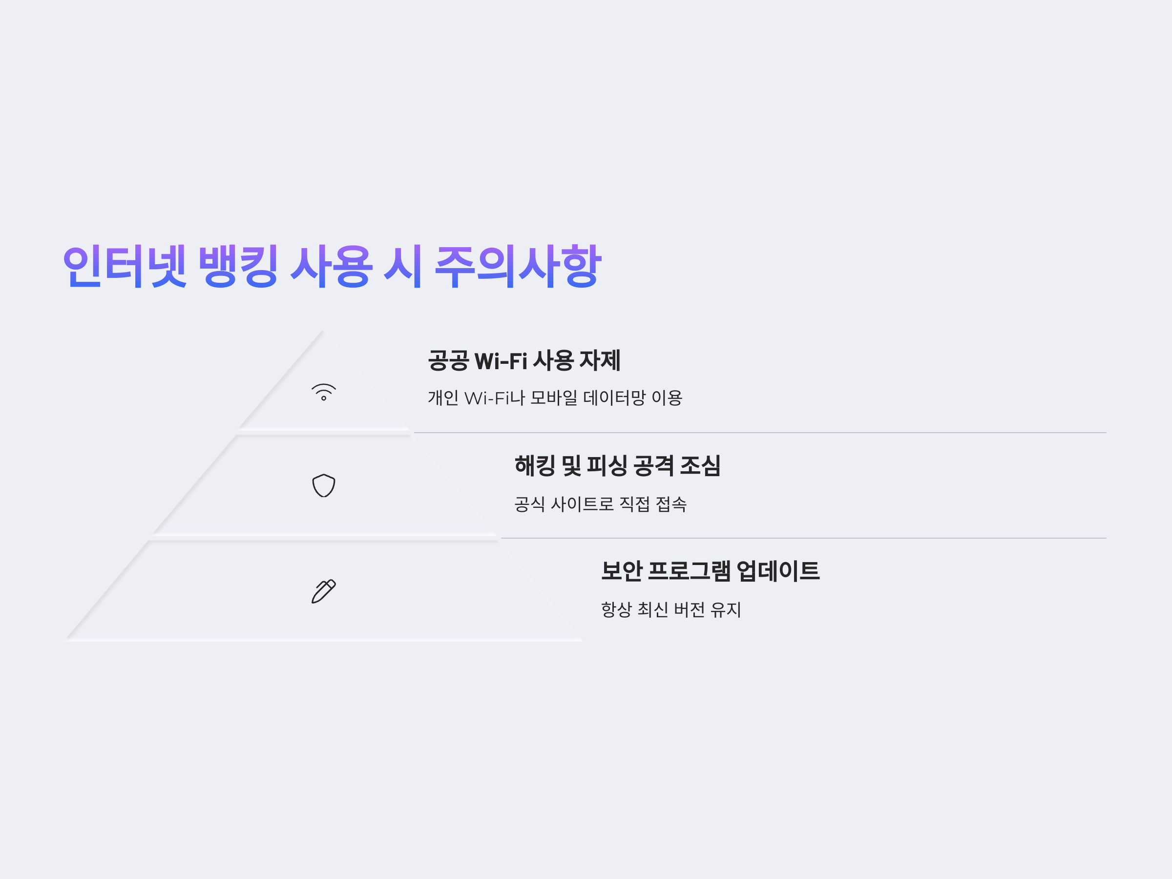 - 공공 Wi-Fi 사용 자제: 공공장소의 Wi-Fi를 사용할 때는 보안이 취약할 수 있으므로, 인터넷 뱅킹을 사용할 때는 개인 Wi-Fi 또는 모바일 데이터망을 이용하는 것이 안전합니다.