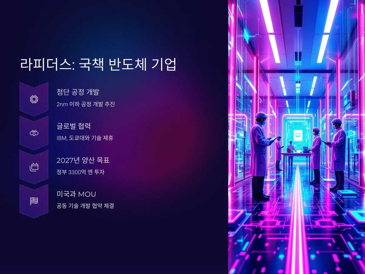 일본 정부는 반도체 산업 부활을 위해 라피더스(Rapidus)라는 국책 기업을 설립하며 미래 반도체 공정 개발에 총력을 기울이고 있다. 라피더스는 IBM, 도쿄대, 그리고 글로벌 소재·장비 업체와의 협력을 통해 2nm 이하 첨단 공정 개발에 나서고 있으며, 이를 통해 2027년까지 양산 체계를 구축할 계획이다.