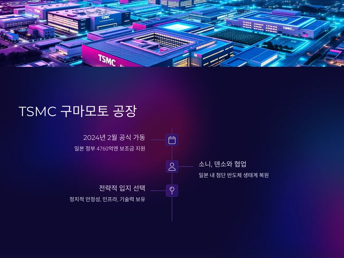 2024년 2월, 일본 구마모토에 위치한 TSMC의 공장이 공식 가동을 시작했다. 이 공장은 일본 정부의 막대한 보조금(약 4760억엔)을 받아 설립된 것으로, 소니와 덴소 등 일본 굴지의 기업들과 협업하여 실리콘 생산을 본격화했다. 이는 단순한 해외투자 유치가 아닌, 일본 내 첨단 반도체 생태계 복원의 신호로 해석된다.