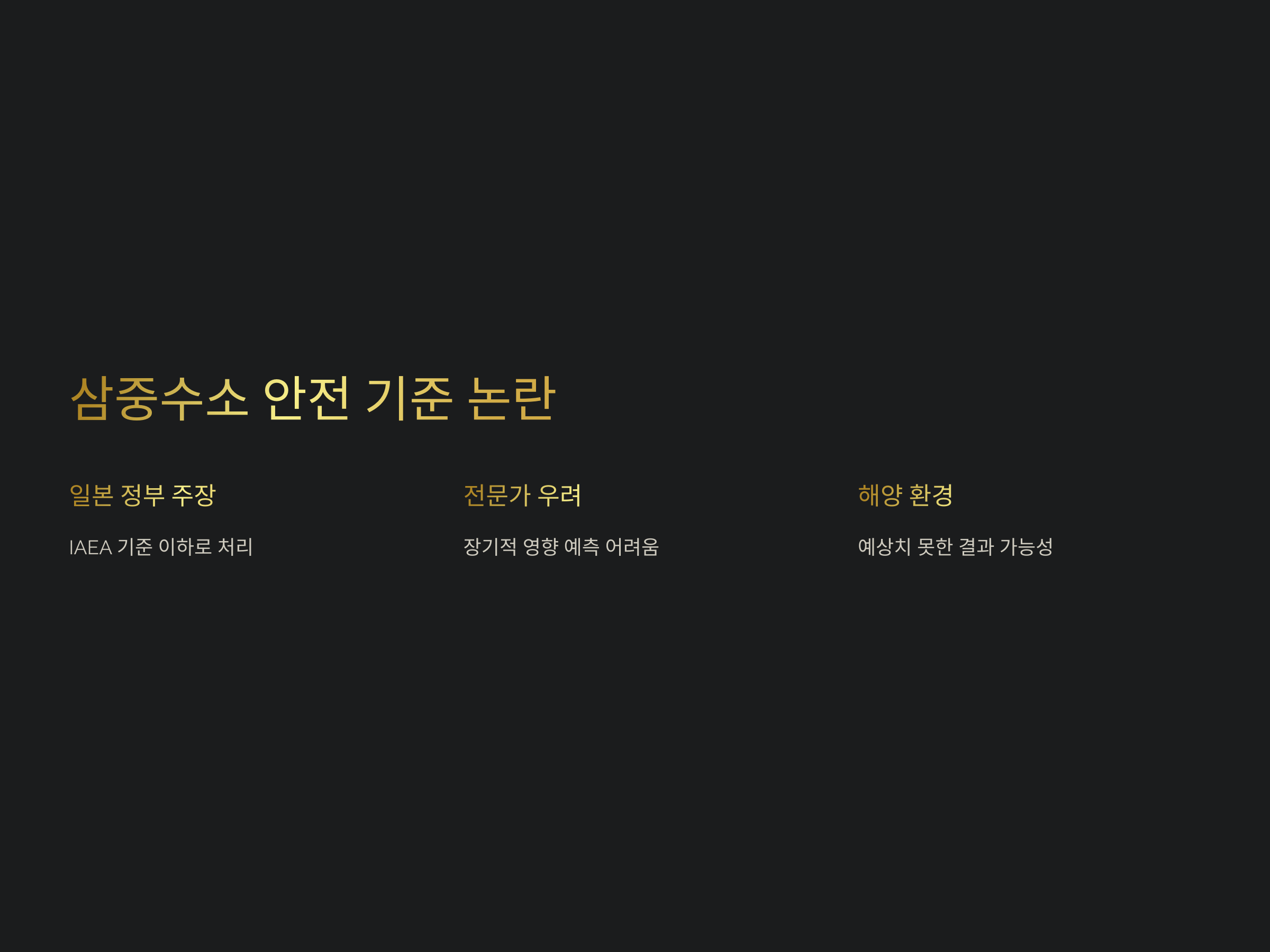 그러나 일부 전문가들은 이 농도가 여전히 안전하지 않다고 지적하고 있습니다. 삼중수소가 해양 생물에 미치는 영향은 실험적으로 입증되지 않았으며, 그 영향을 명확히 예측하기 어렵다는 것입니다【6†source】. 이와 함께 방류 후 해양 환경에서 발생할 수 있는 예상치 못한 결과들에 대한 우려도 여전합니다.