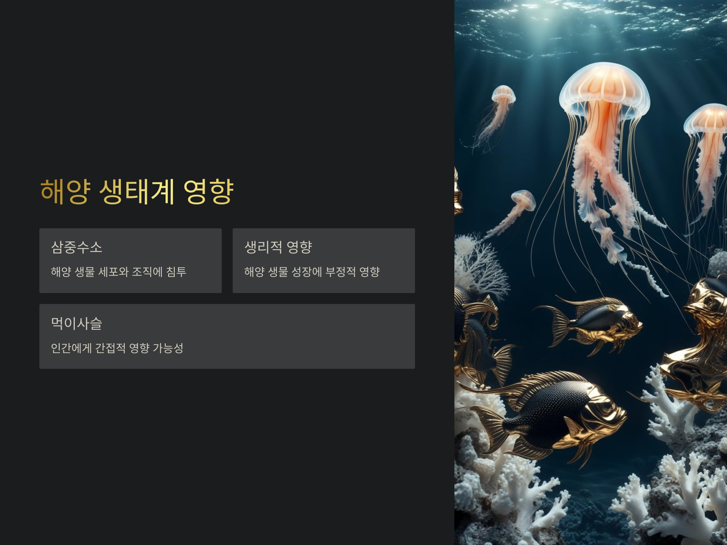 후쿠시마 오염수에는 방사성 물질이 포함되어 있어, 그 방류가 해양 생태계에 미칠 영향은 매우 심각할 수 있습니다. 특히 삼중수소와 같은 물질은 해양 생물들의 세포와 조직에 침투하여 생리적 기능에 영향을 미칠 수 있습니다【6†source】. 삼중수소는 물과 화학적으로 동일해 걸러내기 어렵고, 물고기나 다른 해양 생물들이 이를 흡수할 수 있습니다. 이로 인해 해양 생물들이 피해를 입을 가능성은 커지고 있으며, 나아가 인간에게도 간접적인 영향을 미칠 수 있습니다.