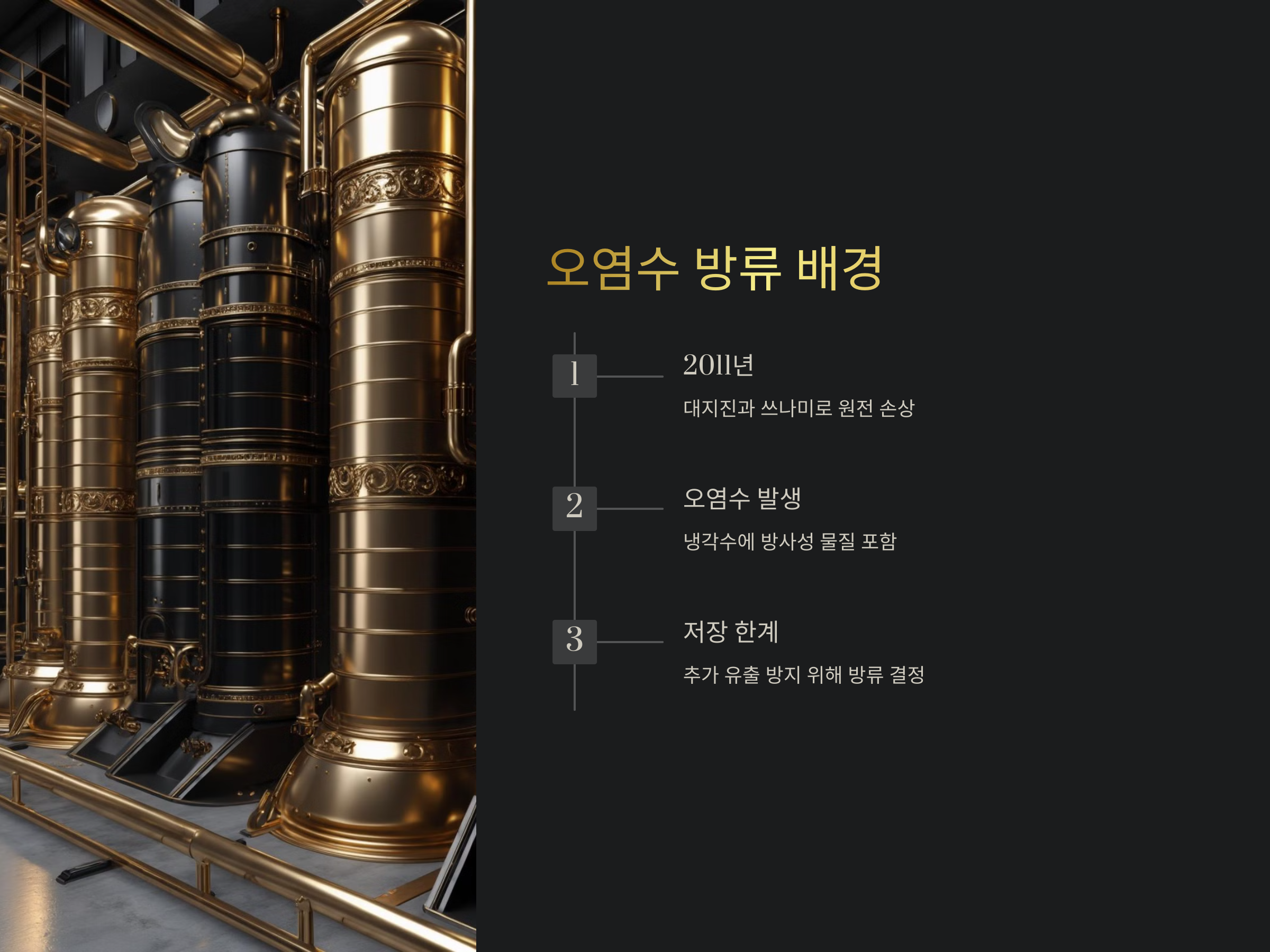 후쿠시마 원전 사고가 발생한 2011년, 대지진과 쓰나미로 인해 후쿠시마 제1원전이 심각하게 손상되었고, 이후 방사성 물질이 포함된 오염수가 계속해서 발생했습니다. 이 오염수는 냉각수로 사용되다가 방사성 물질을 포함하게 되었고, 이를 어떻게 처리할 것인가가 큰 문제로 떠오르게 되었습니다.