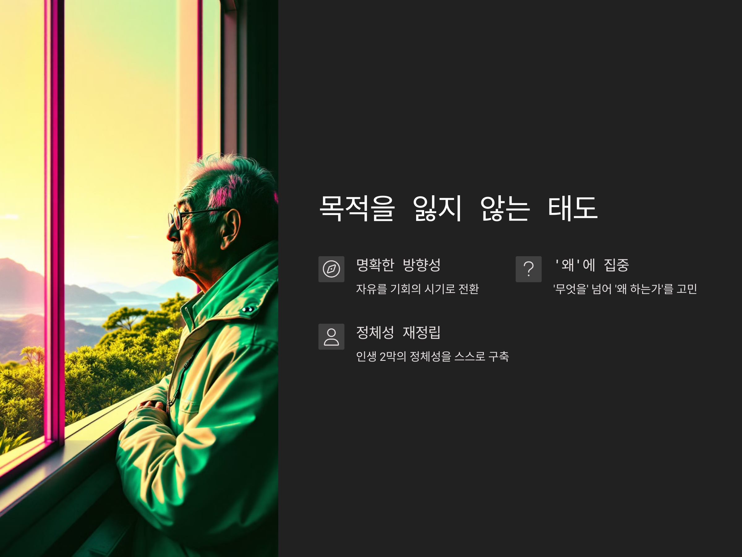 이들은 퇴직을 인생의 마침표가 아닌 새로운 출발선으로 바라봅니다. 이는 마치 이직이나 전직처럼 새로운 정체성을 재정립하는 과정이기도 하며, 결국 ‘인생 2막’의 정체성을 자신이 스스로 만들어가는 태도로 연결됩니다. 이런 사람들은 새로운 커리어를 설계할 때도 ‘남이 보기에 좋은 것’이 아닌, 자신의 신념에 맞는 일을 선택하고, 그 과정을 통해 삶의 깊이를 더합니다.
