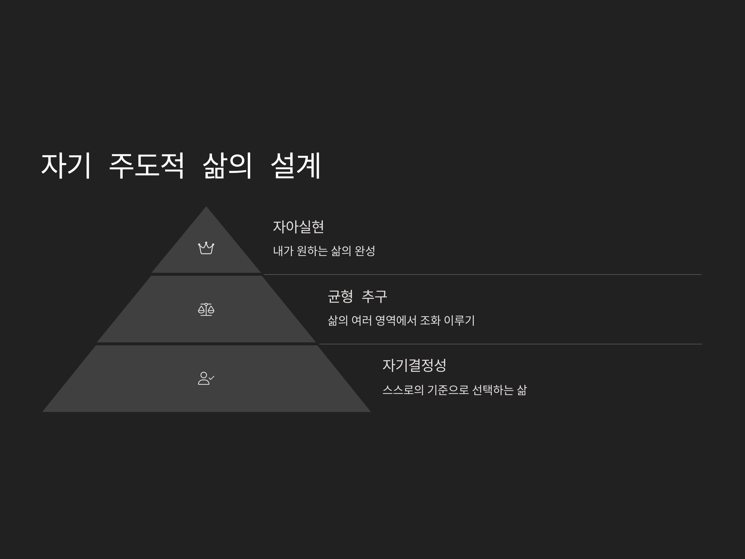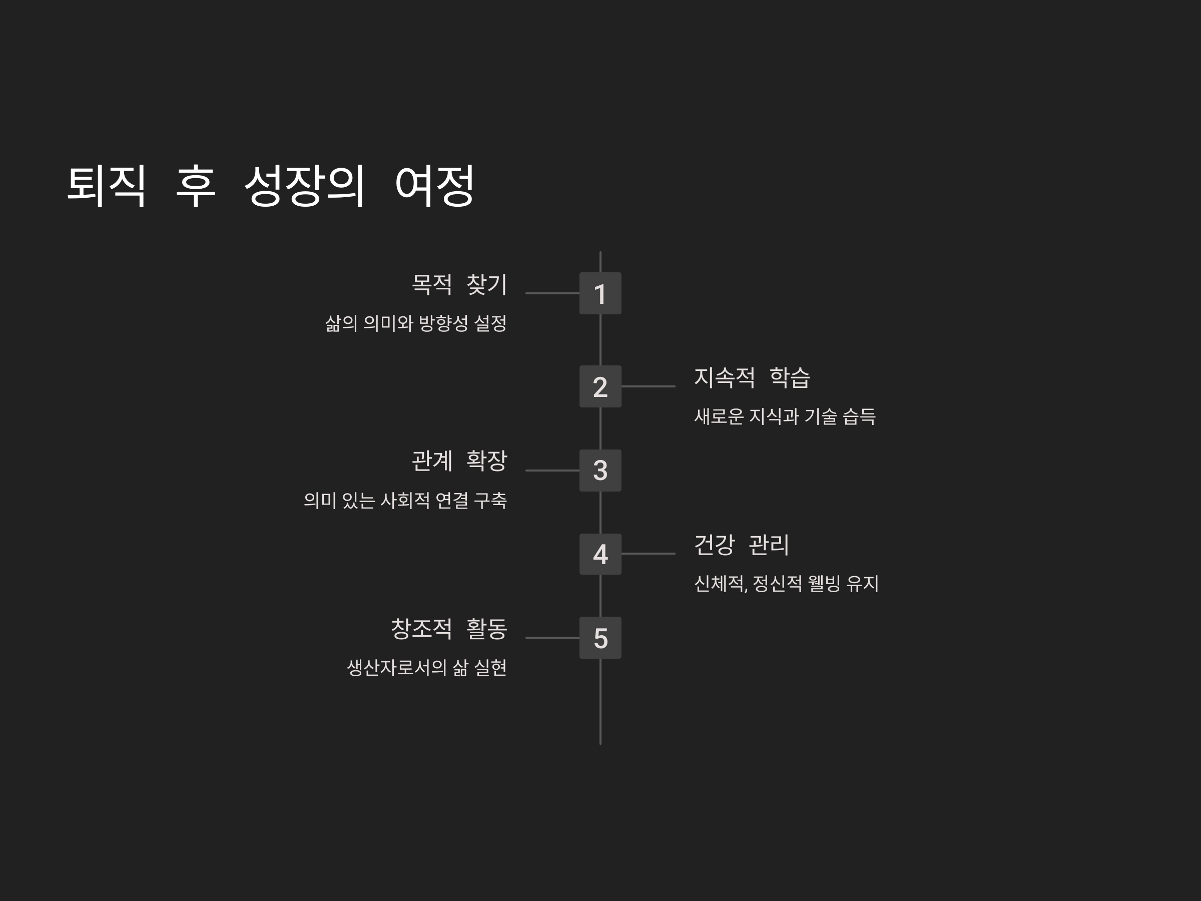 궁극적으로 퇴직 후에도 성장하는 사람들은 자신의 삶을 타인의 기준이 아닌 스스로의 기준으로 판단합니다. 누가 시켜서 하는 삶이 아니라, 내가 원하는 것을 능동적으로 선택하는 자세는 강한 주도성과 자기결정성을 기반으로 합니다. 이는 자신이 만든 기준으로 목표를 세우고, 그 방향대로 밀고 나가는 힘을 줍니다.