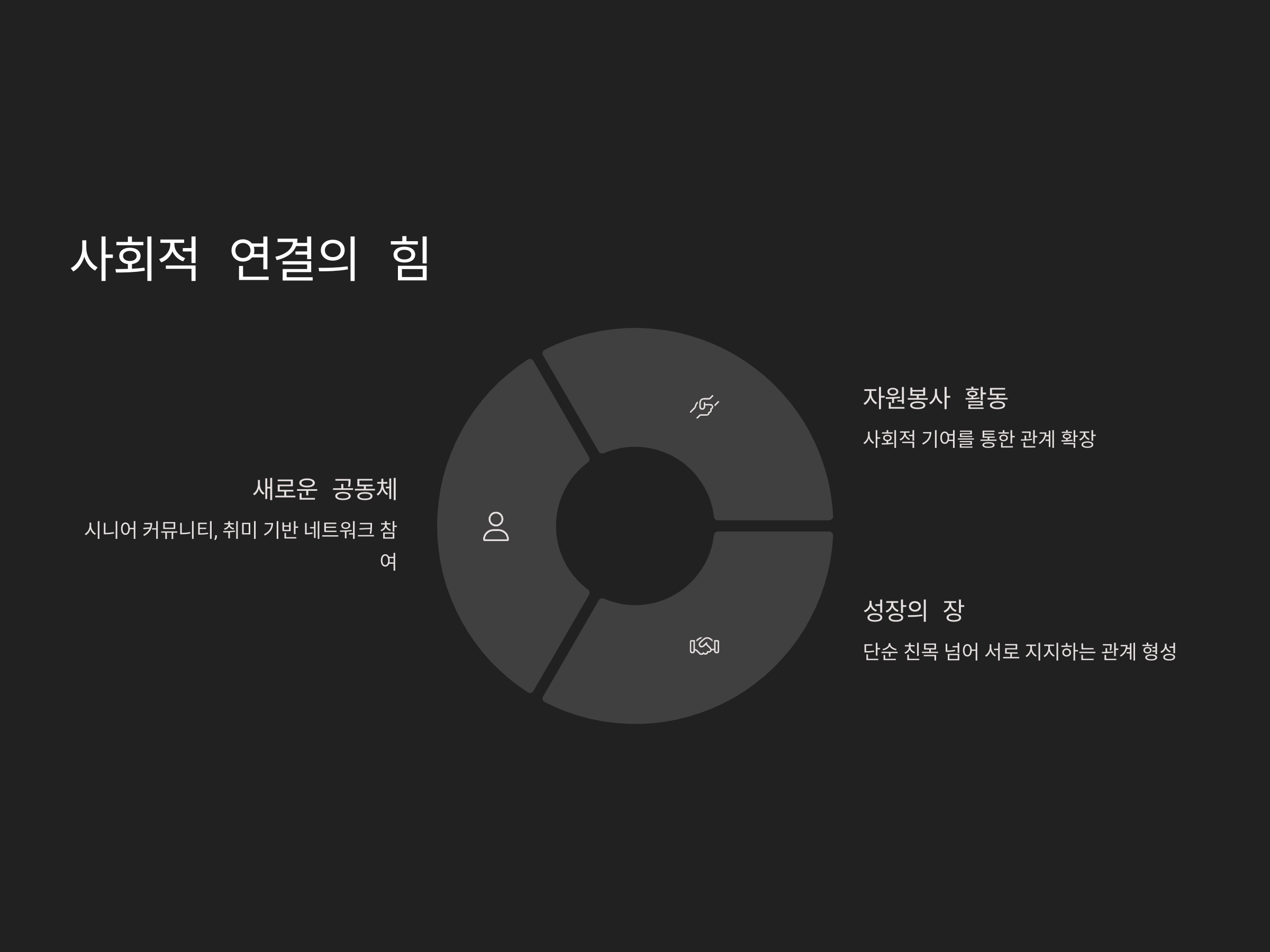 성장하는 사람들의 또 다른 특징은 ‘관계’입니다. 퇴직 이후의 고립은 정서적으로나 건강적으로 부정적인 영향을 미치기 쉬우나, 활발한 인간관계를 유지하는 사람은 그렇지 않습니다. 이들은 기존의 직장 관계에만 의존하지 않고, 새로운 공동체에 참여하거나 자원봉사 활동 등을 통해 사회적 연결을 넓혀갑니다.
