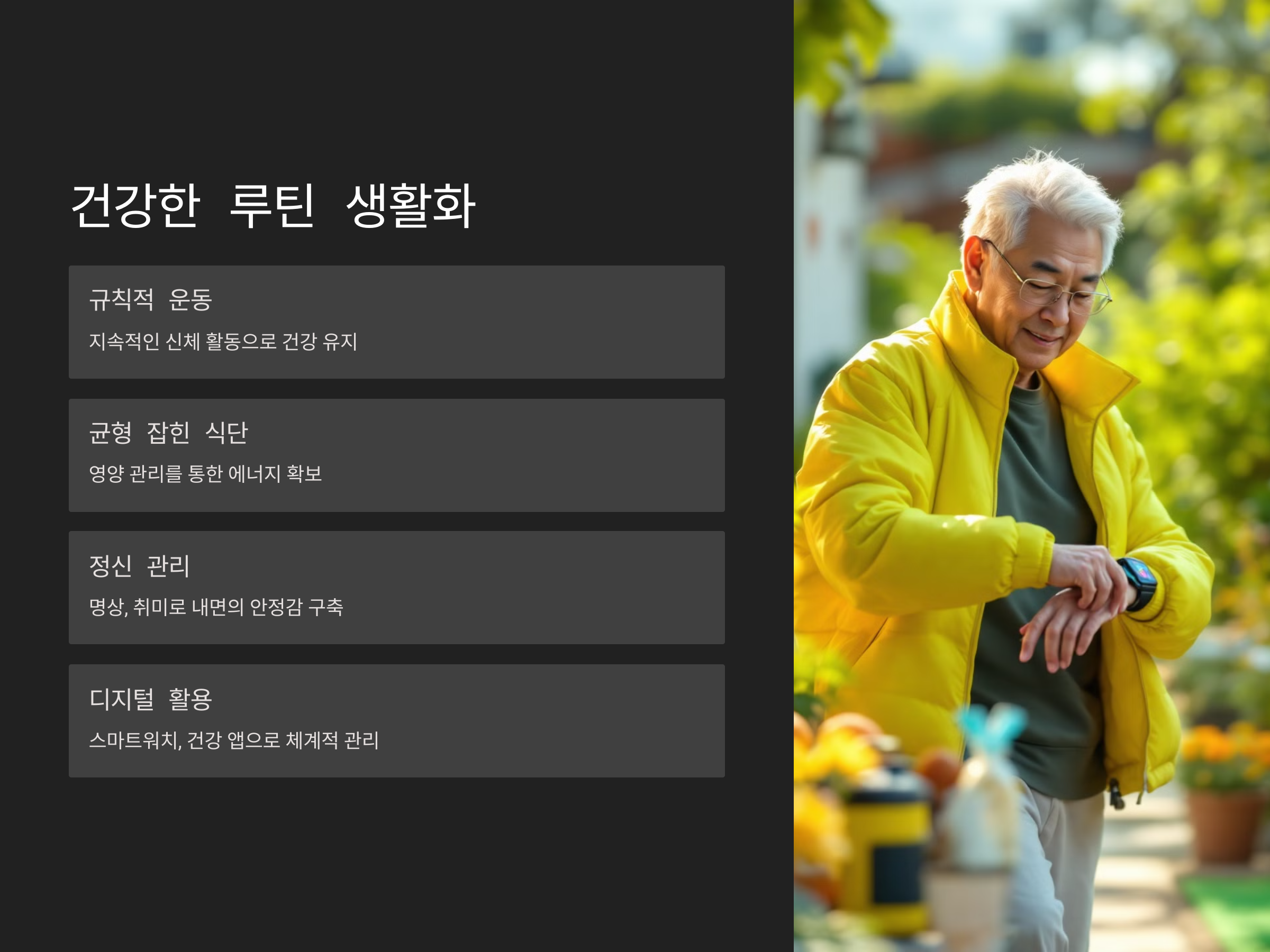 지속 가능한 성장을 위해 기본이 되는 것은 결국 ‘건강’입니다. 퇴직 후 시간이 많아졌다고 해서 불규칙한 생활에 빠지는 대신, 이들은 오히려 철저한 자기관리를 통해 하루를 설계합니다. 규칙적인 운동, 균형 잡힌 식단, 명상과 같은 정신 관리 등 자신만의 루틴을 만들어 꾸준히 실천하는 것이 특징입니다.