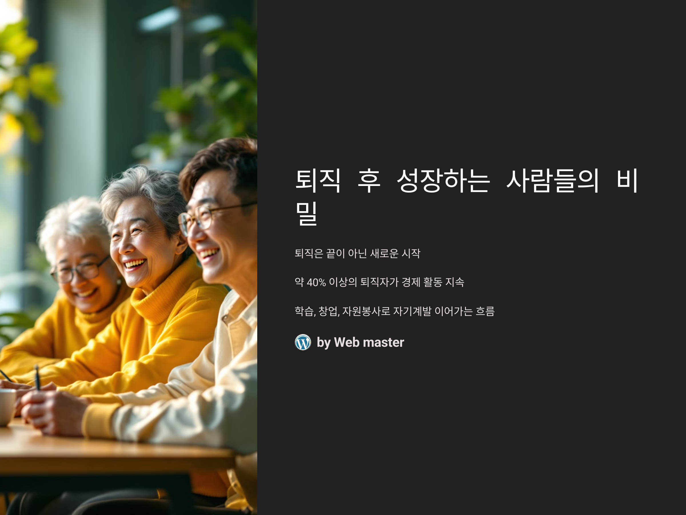 퇴직은 끝이 아니라 새로운 시작입니다. 퇴직 후에도 자신만의 삶을 주도적으로 이끌며 지속적인 성장을 이뤄내는 사람들이 있습니다. 단순한 취미생활을 넘어 새로운 인생 2막을 설계하고, 사회적 기여까지 이어가는 그들의 공통점은 무엇일까요? 최근 변화한 노동시장과 초고령 사회로의 진입은 퇴직 후 삶에 대한 패러다임을 바꾸고 있습니다. 단순한 '노년의 여유'가 아니라, '새로운 경력과 성과'를 추구하는 흐름으로 확장되고 있는 것이죠. 특히 퇴직자의 약 40% 이상이 퇴직 후에도 일정한 형태의 경제 활동을 지속하고 있으며, 학습, 창업, 자원봉사 등 다양한 방식으로 자기계발을 이어가고 있습니다. 이러한 흐름은 '에이징 인플루언서', '노후 창업' 등의 키워드로도 확산 중입니다. 이 글에서는 퇴직 이후에도 멈추지 않고 끊임없이 배우고 도전하며, 의미 있는 변화를 만들어가는 이들의 특징을 깊이 있게 살펴봅니다.