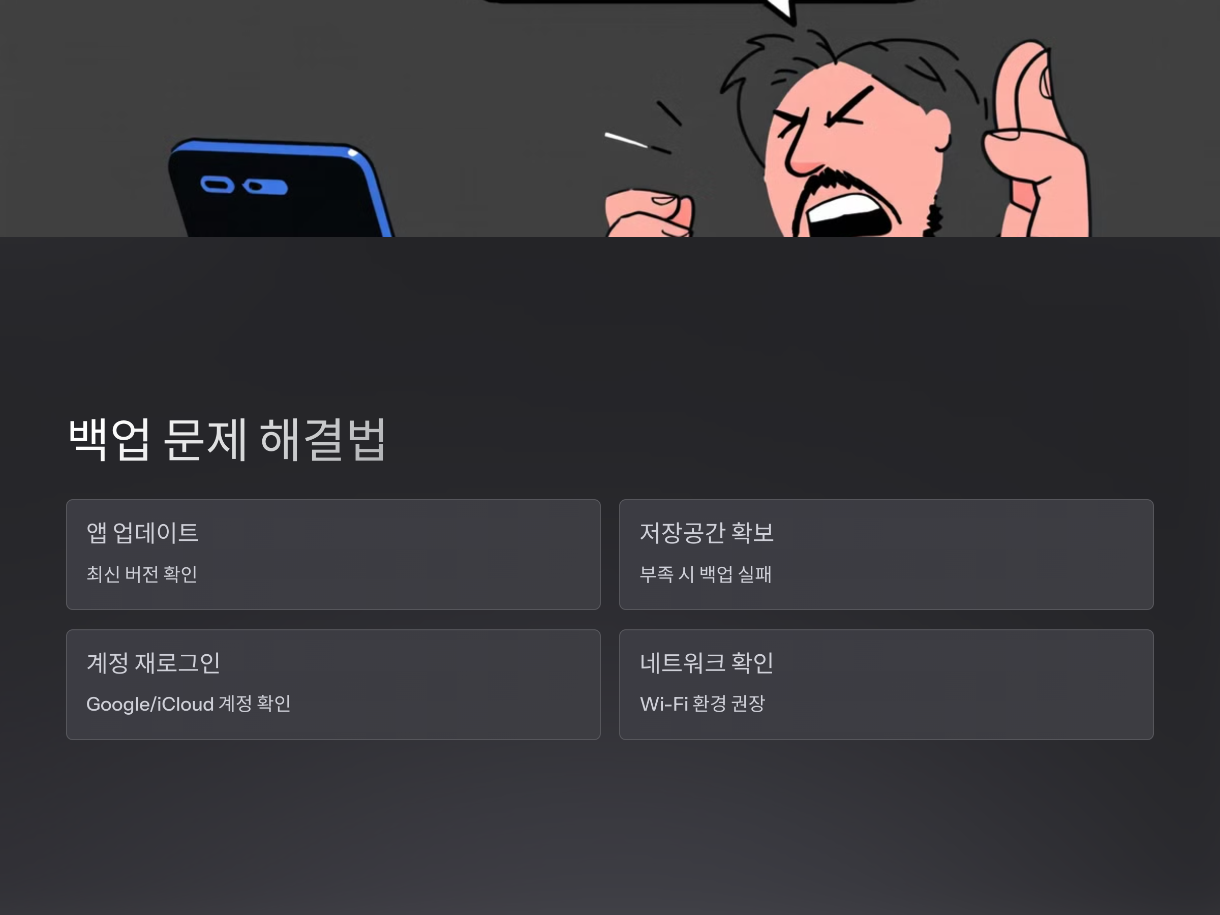 - 저장 공간 확인: iCloud, Google Drive 공간 부족하면 실패
