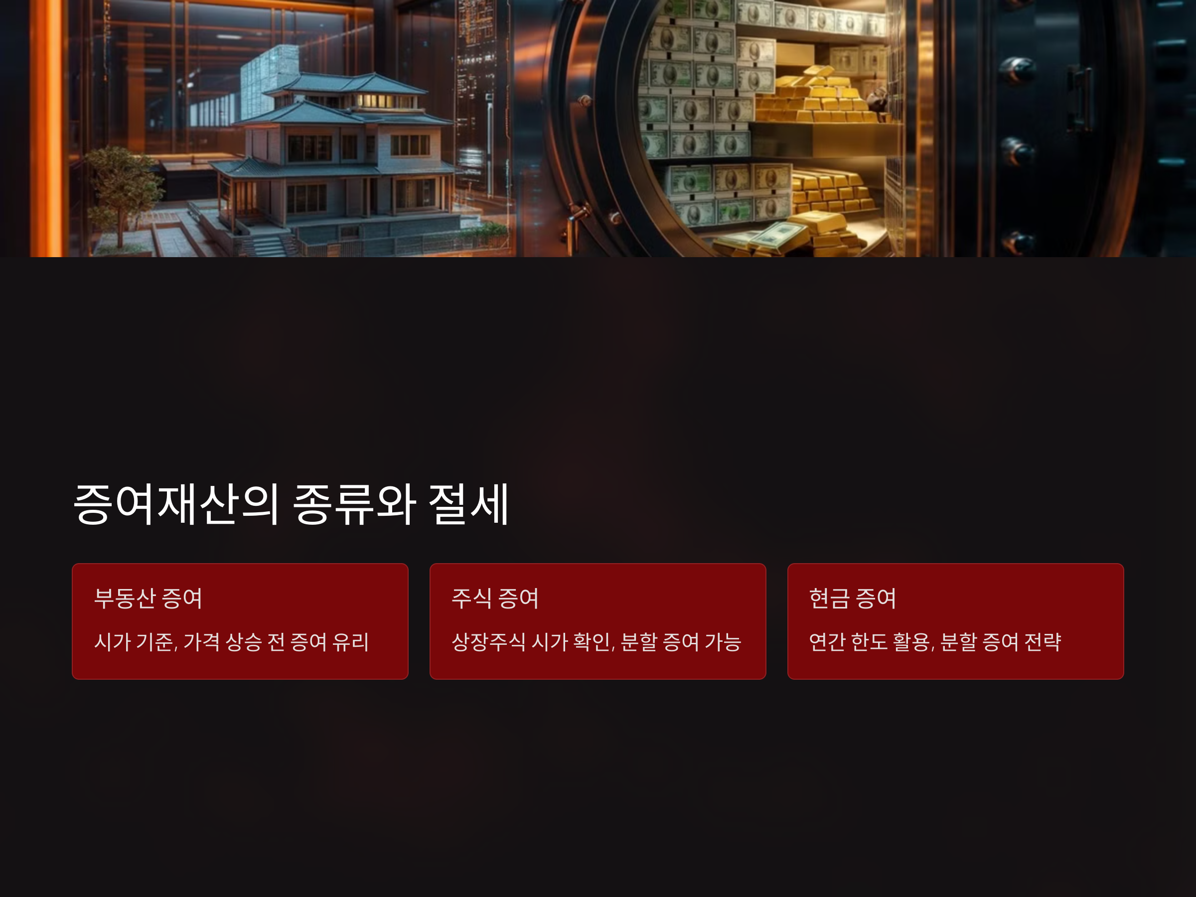 증여할 자산의 종류에 따라 세금 부담을 다르게 할 수 있습니다. 현금 외에도 부동산, 주식, 예금 등 다양한 자산을 증여할 수 있는데, 각 자산에 따른 세금 부담 차이를 고려하여 절세 전략을 세울 수 있습니다.